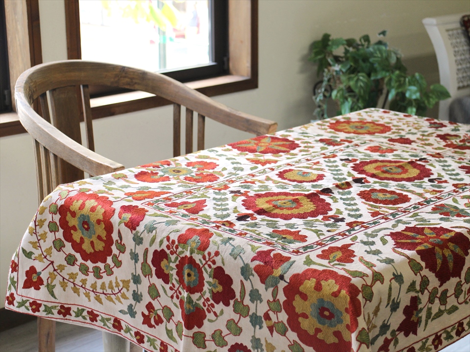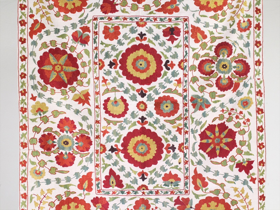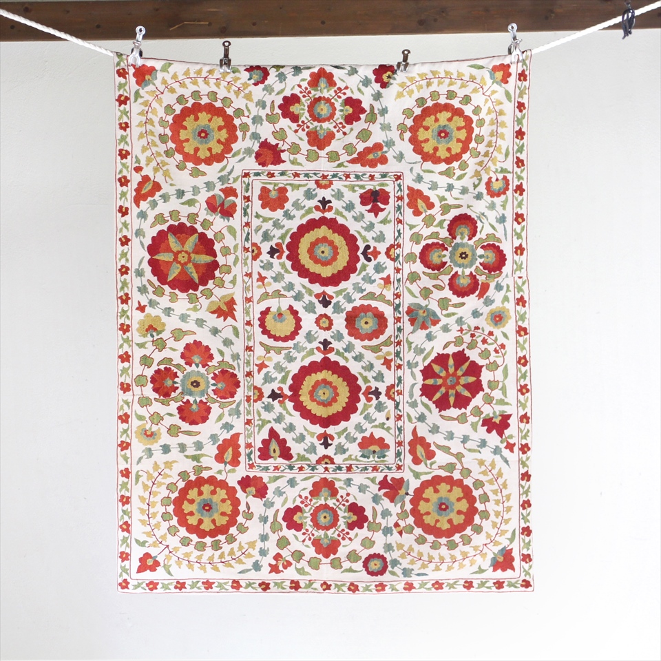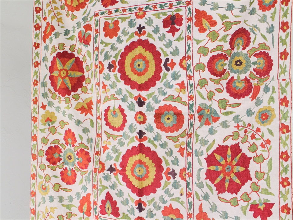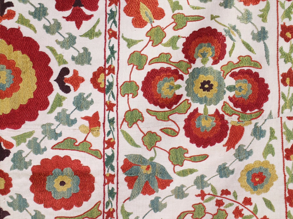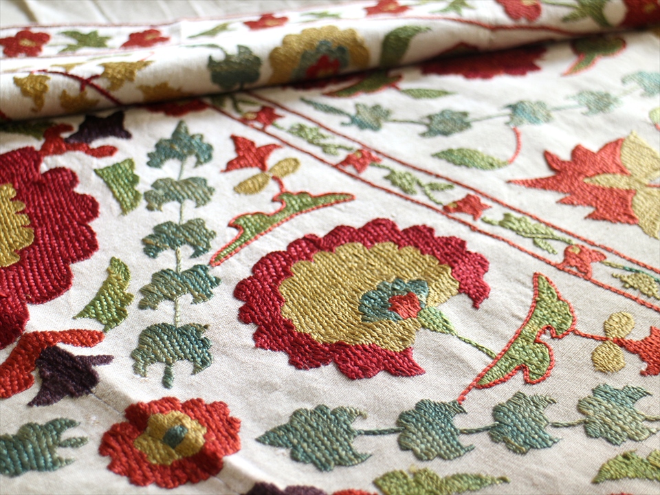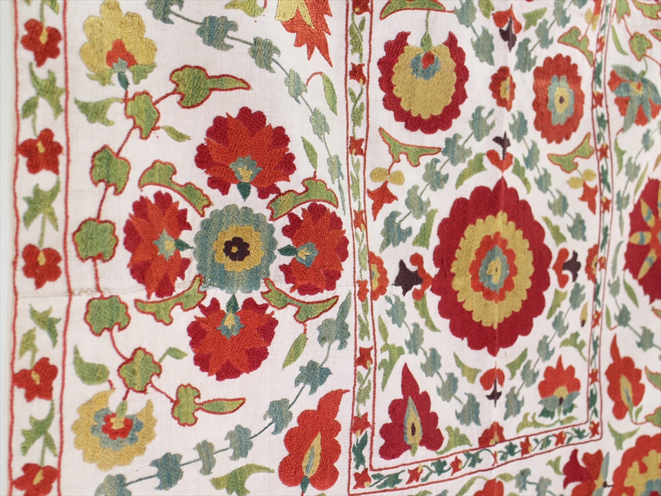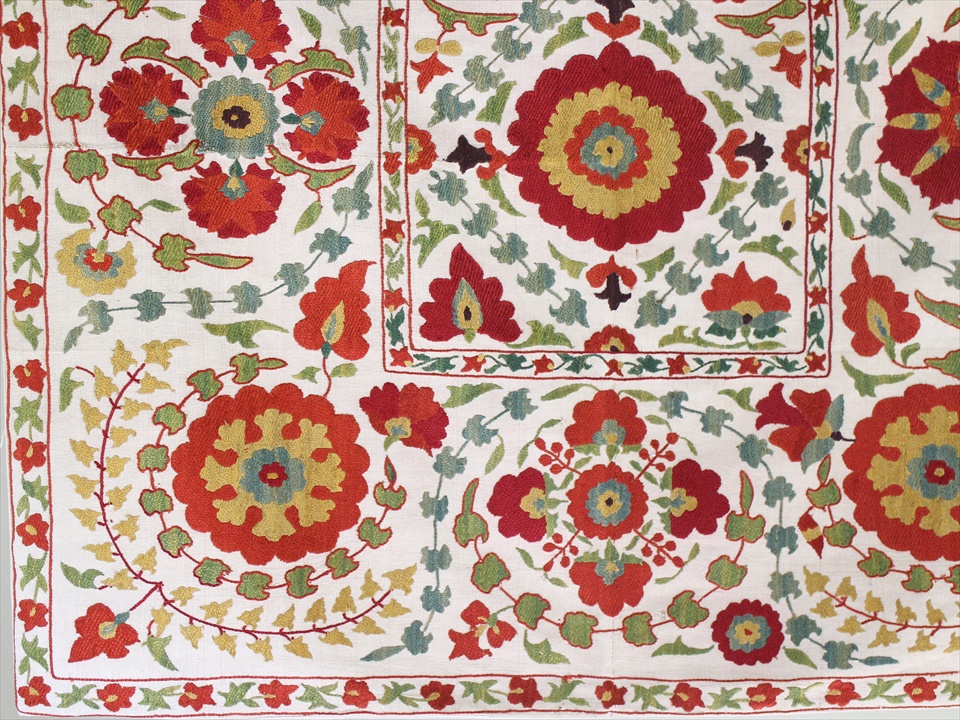 【リプロダクション・スザンニ】中央アジア・ウズベキスタン共和国で作られたシルク糸の手刺繍布「スザンニ」。アンティークリプロダクションは、主に18世紀中ごろから19世紀末にかけて作られたスザンニのデザインを再現したもので、一時は途絶えてしまった伝統が、ソヴィエトから独立した1991年以降に再び取り戻され、現代に受け継がれているものです。