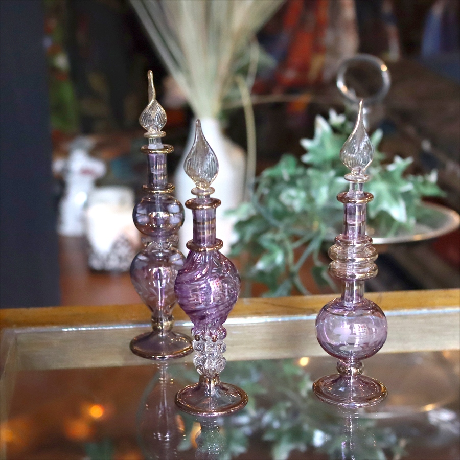 アラビアンな輝きの香水瓶。約12cmの高さのミニサイズ3本セットです。エジプトのカイロにて職人さんが一つ一つ手作りで作っているので、カラーやデザインのバリエーションも様々です。