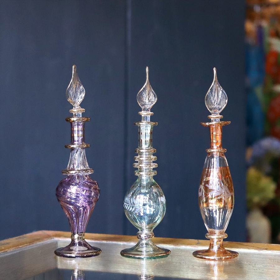 アラビアンな輝きの香水瓶。約12cmの高さのミニサイズ3本セットです。エジプトのカイロにて職人さんが一つ一つ手作りで作っているので、カラーやデザインのバリエーションも様々です。