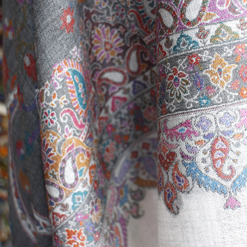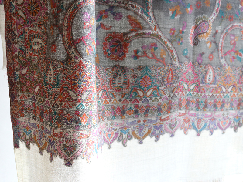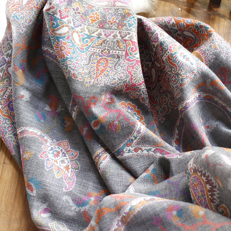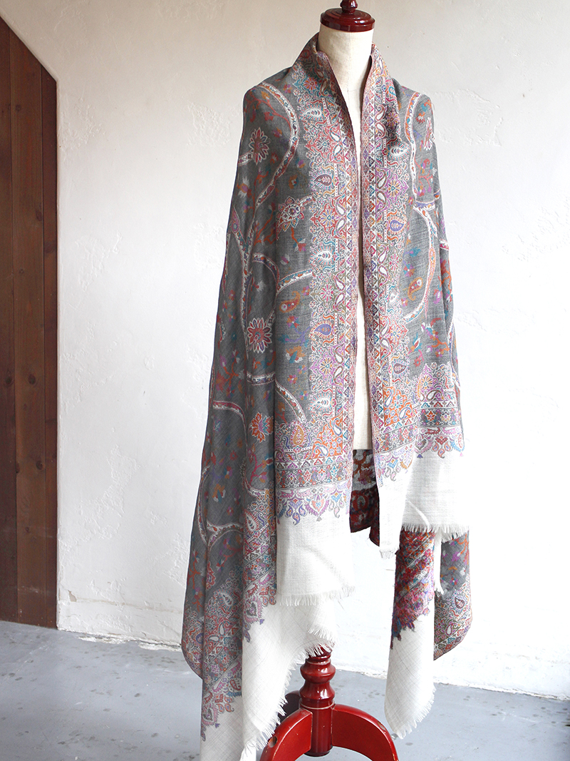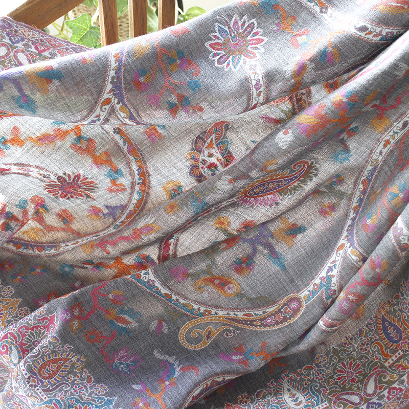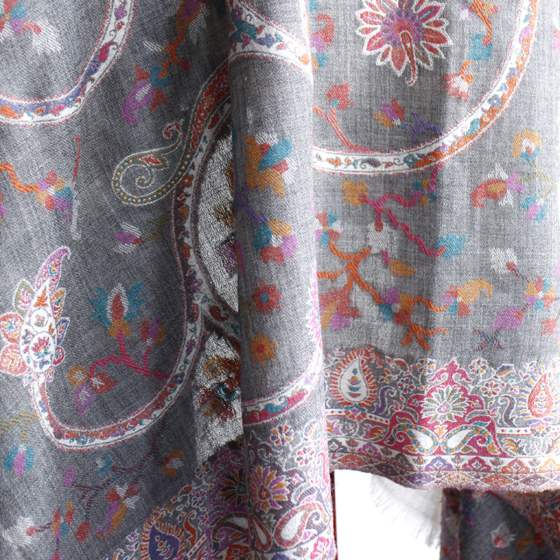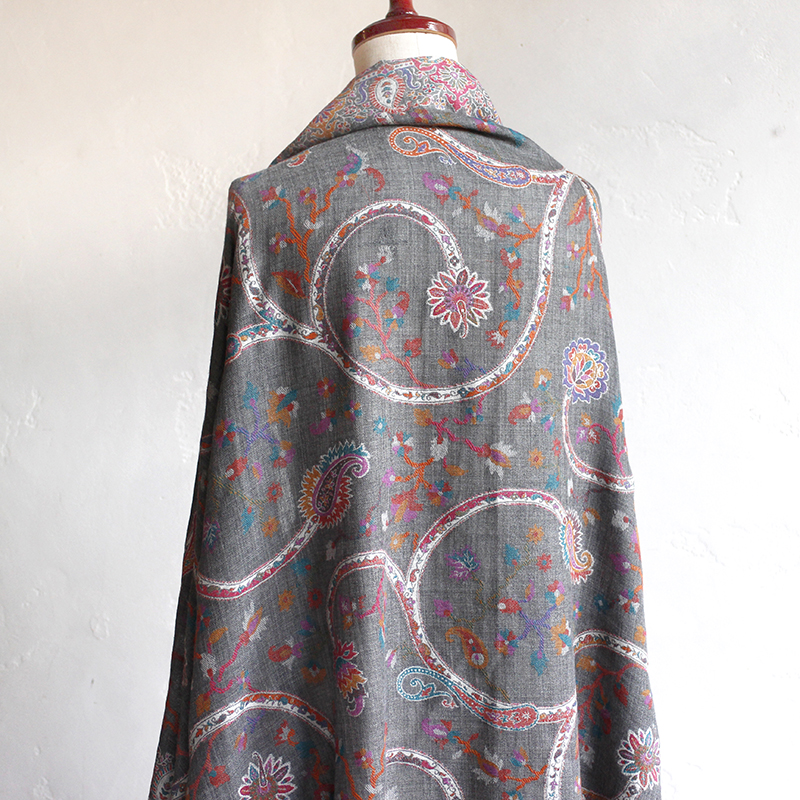 ウールのストール・/大判サイズグレー・ペイズリーと花のモチーフ