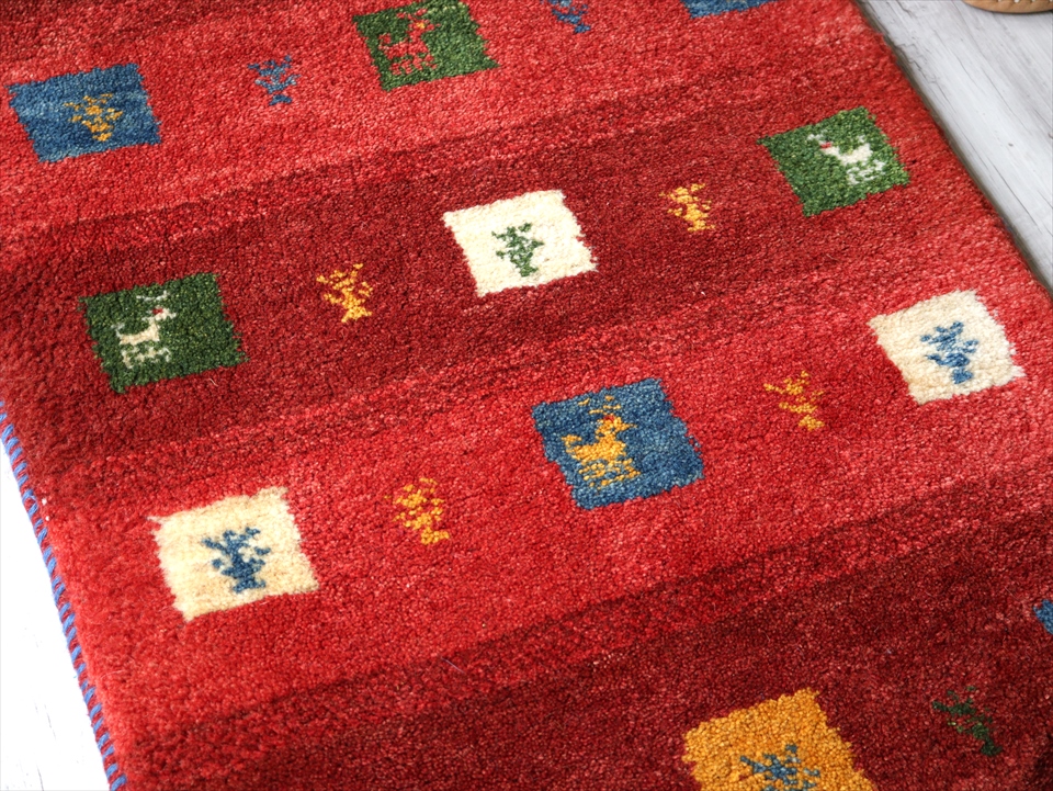 ギャッベ 手織りラグ イラン製 ウール100% 玄関マットサイズ85×60cm レッド ボーダーストライプ 動物と植物モチーフ