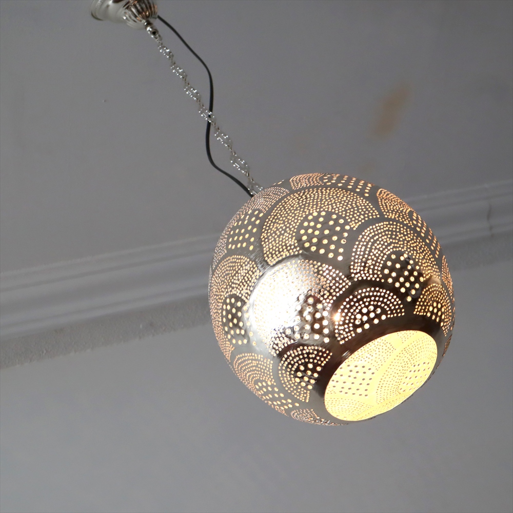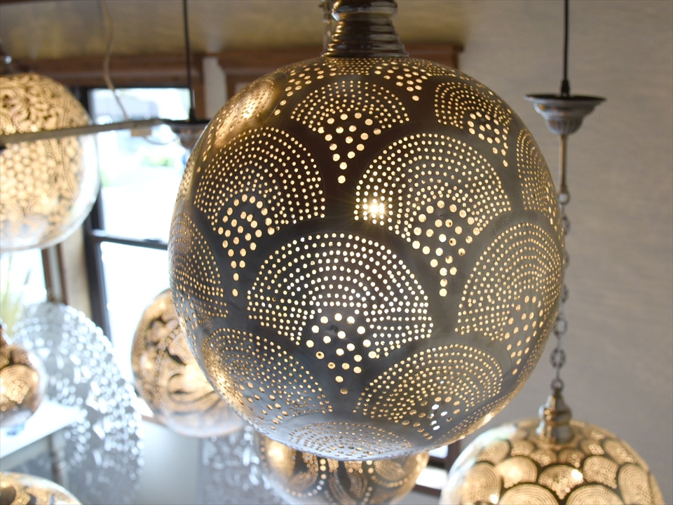 メタルを薄く加工し、コンコンと小さな穴をあけて光をデザインするランプシェードを作りました。中世から作られて来た伝統的な技法で、細工からこぼれる光が壁に映り、エキゾチックな雰囲気を楽しめます。