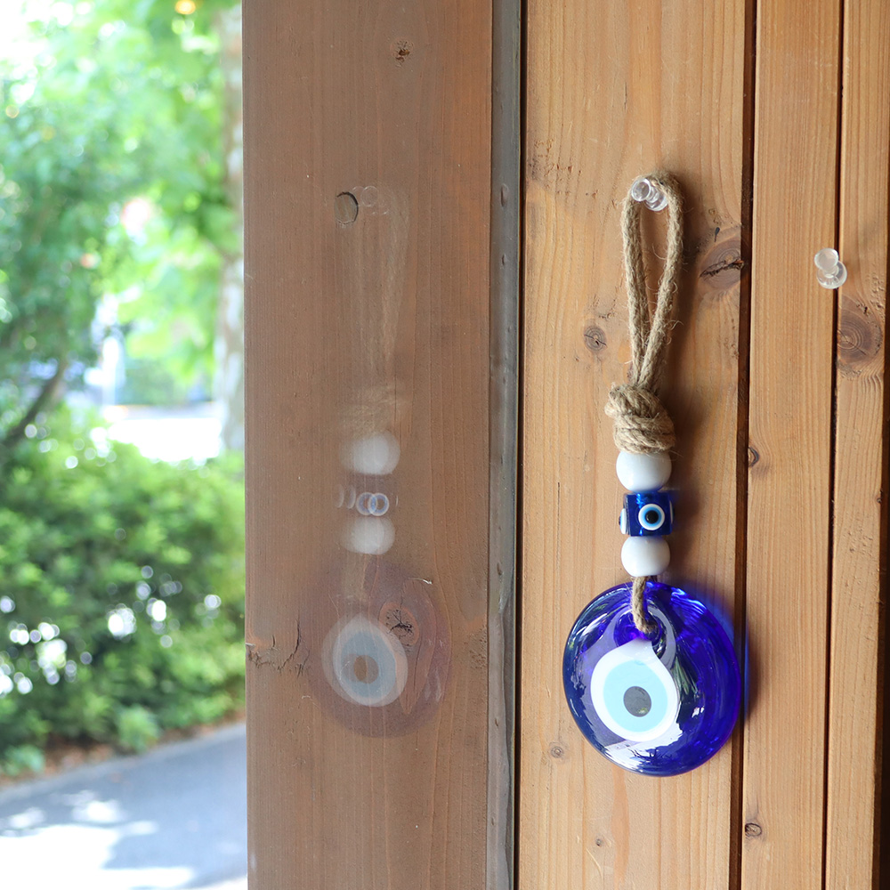 直径約7.5~8cmのナザールボンジュウに、しっかりとした麻ひもを合わせたシンプルなデザインです。