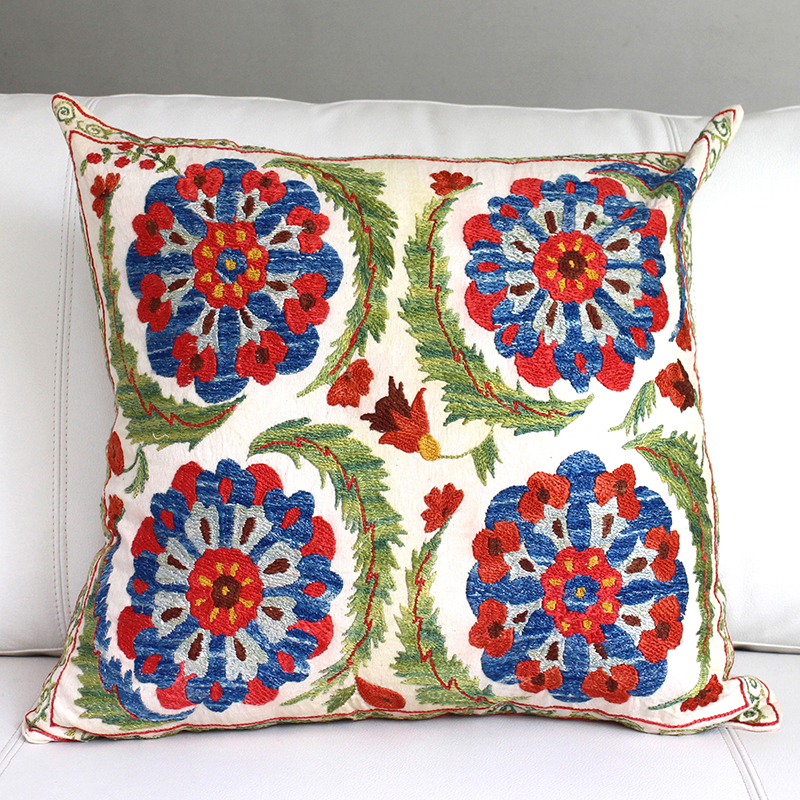 ウズベキスタンの伝統の手刺繍布・スザンニをクッションカバーに仕立てました。緻密なニードルワークによるチェーンステッチの手刺繍が見事です。