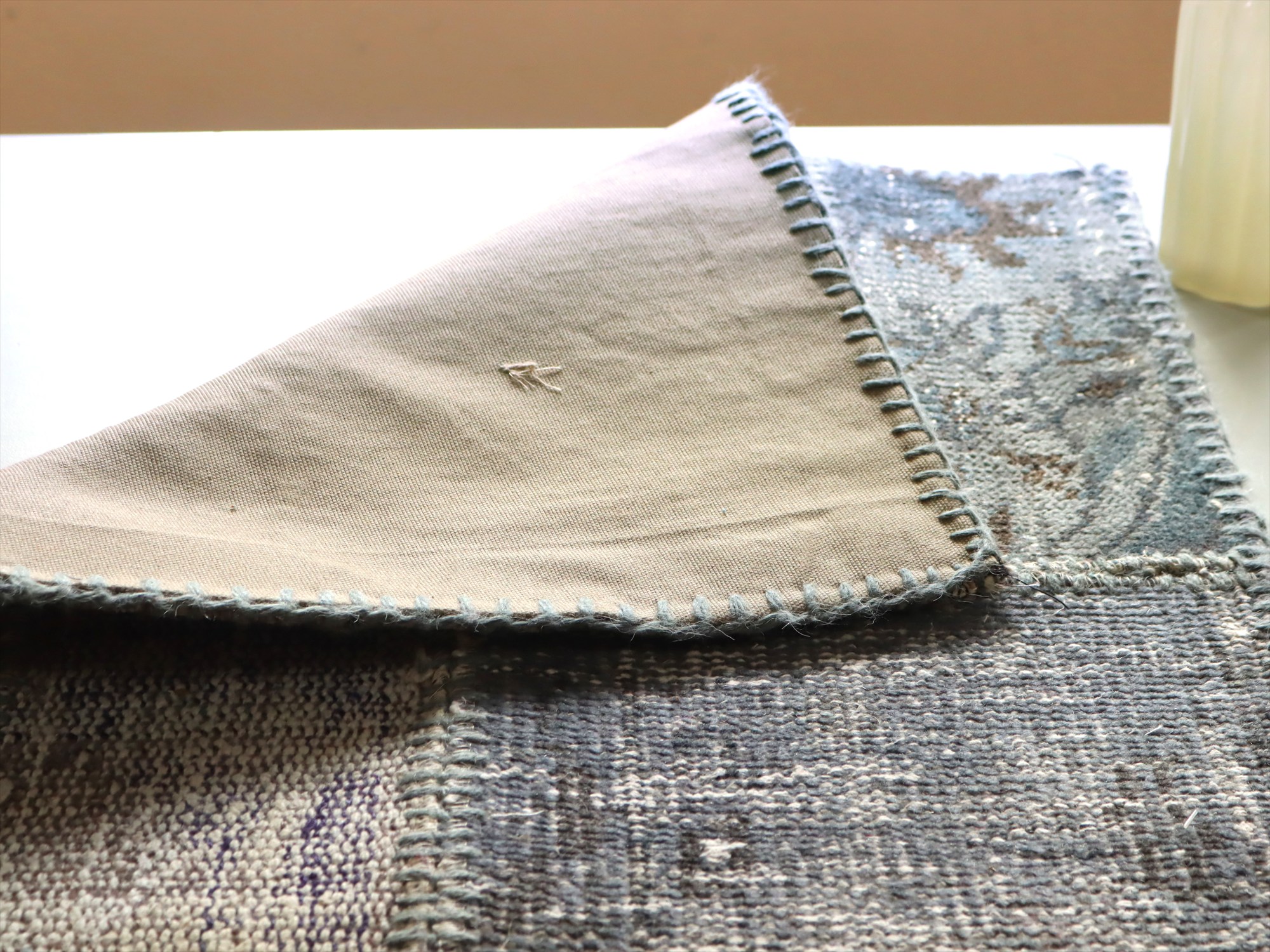 ダメージが多く、使われなくなった古い手織りカーペットを仕立て直したパッチワーク・ラグです。当店では、アナトリア(トルコ地方)のオールドカーペットのみを使い、縫い合わせ部分もミシンを使わず、手作業ではぎ合わせてあります。裏面にはコットン地が張り合わされています。ラグ(カーペット)自体は、パイル(毛足)が擦り減っているところなどが多々ありますが、使い古したラグならではの風合いとご理解ください。