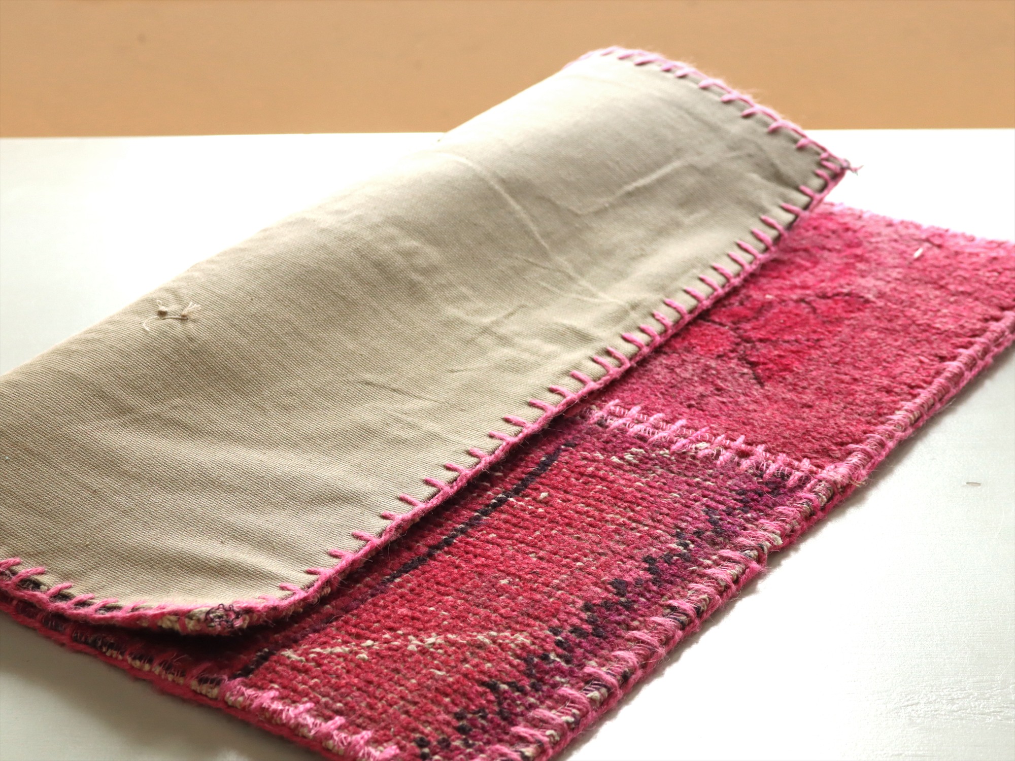 ダメージが多く、使われなくなった古い手織りカーペットを仕立て直したパッチワーク・ラグです。当店では、アナトリア(トルコ地方)のオールドカーペットのみを使い、縫い合わせ部分もミシンを使わず、手作業ではぎ合わせてあります。裏面にはコットン地が張り合わされています。ラグ(カーペット)自体は、パイル(毛足)が擦り減っているところなどが多々ありますが、使い古したラグならではの風合いとご理解ください。