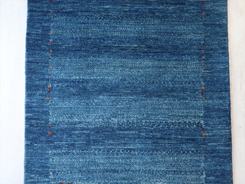 比較的明るめのブルーの濃淡の色の毛糸を使用して、内側はボーダー、外側は枠縁を織ったシンプルで上品デザイン。控えめにはいったドットや小さなモチーフは細かい織りでこそ可能なデザイン。パイル(毛足)の目の方向により、色濃く重厚に見えたり、色鮮やかで明るく見えたりと印象が異なるのも、織り目の細かな最上級のギャベです。