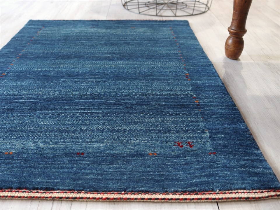 ギャッベ 最上級の織り ロリアタシュ 玄関マットサイズ90×60cm ブルー ボーダー&ドット