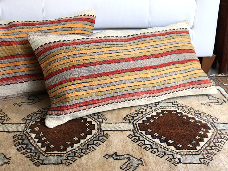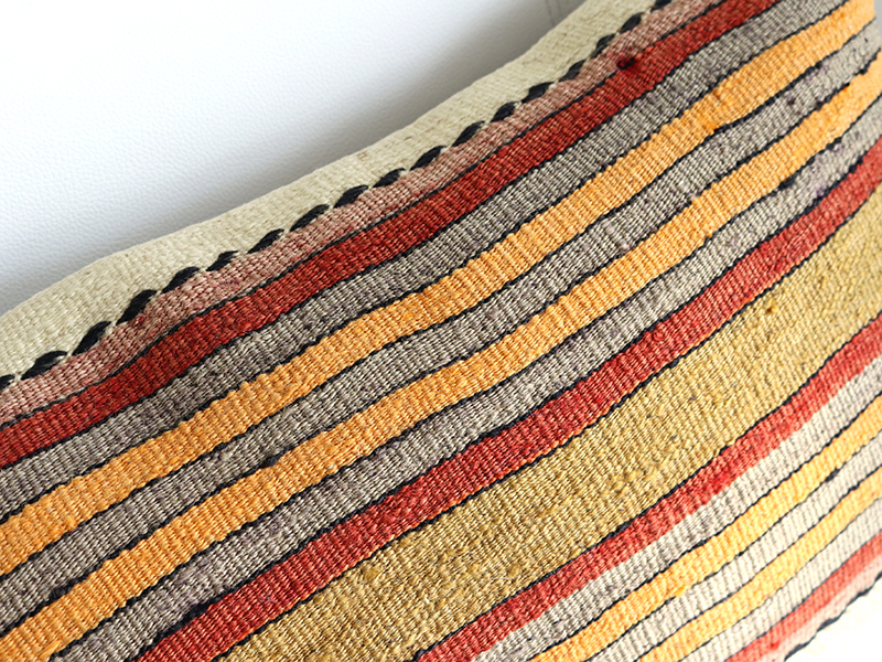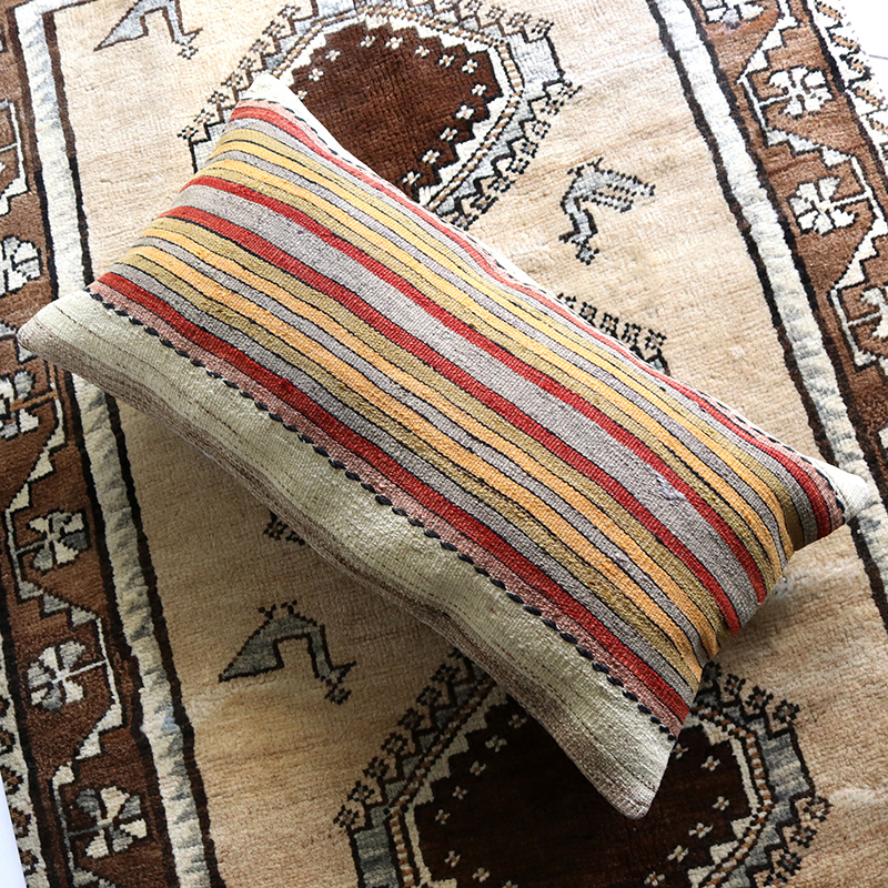 ナチュラルブラウンとアイボリーに、赤と黄色、ブルーグレーのシンプルなストライプデザインのキリム。オールドキリムの質感がありつつも、エスニック感がおさえめで、シンプルなインテリアにもマッチします。
