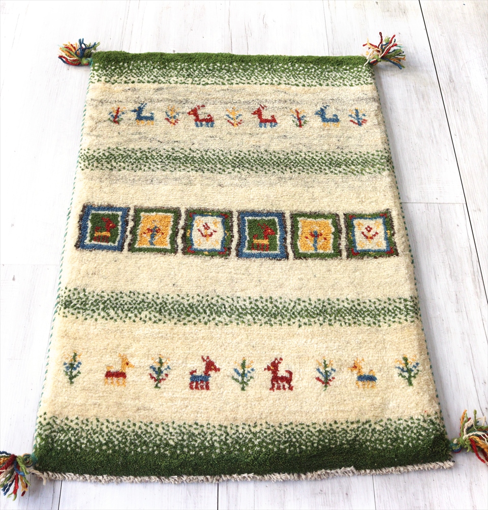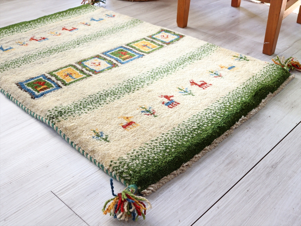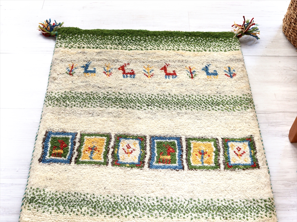 ギャベ 玄関マット イラン製手織りラグ92×60cm ナチュラルアイボリー&グリーン カラフルタイル 動物と植物モチーフ