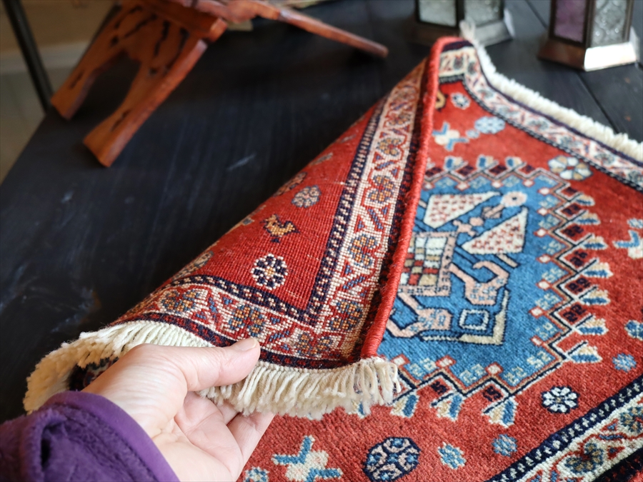 - ギャッベ カシュクーリ 44x41cm オレンジがかった赤色&青のメダリオン・花と鳥