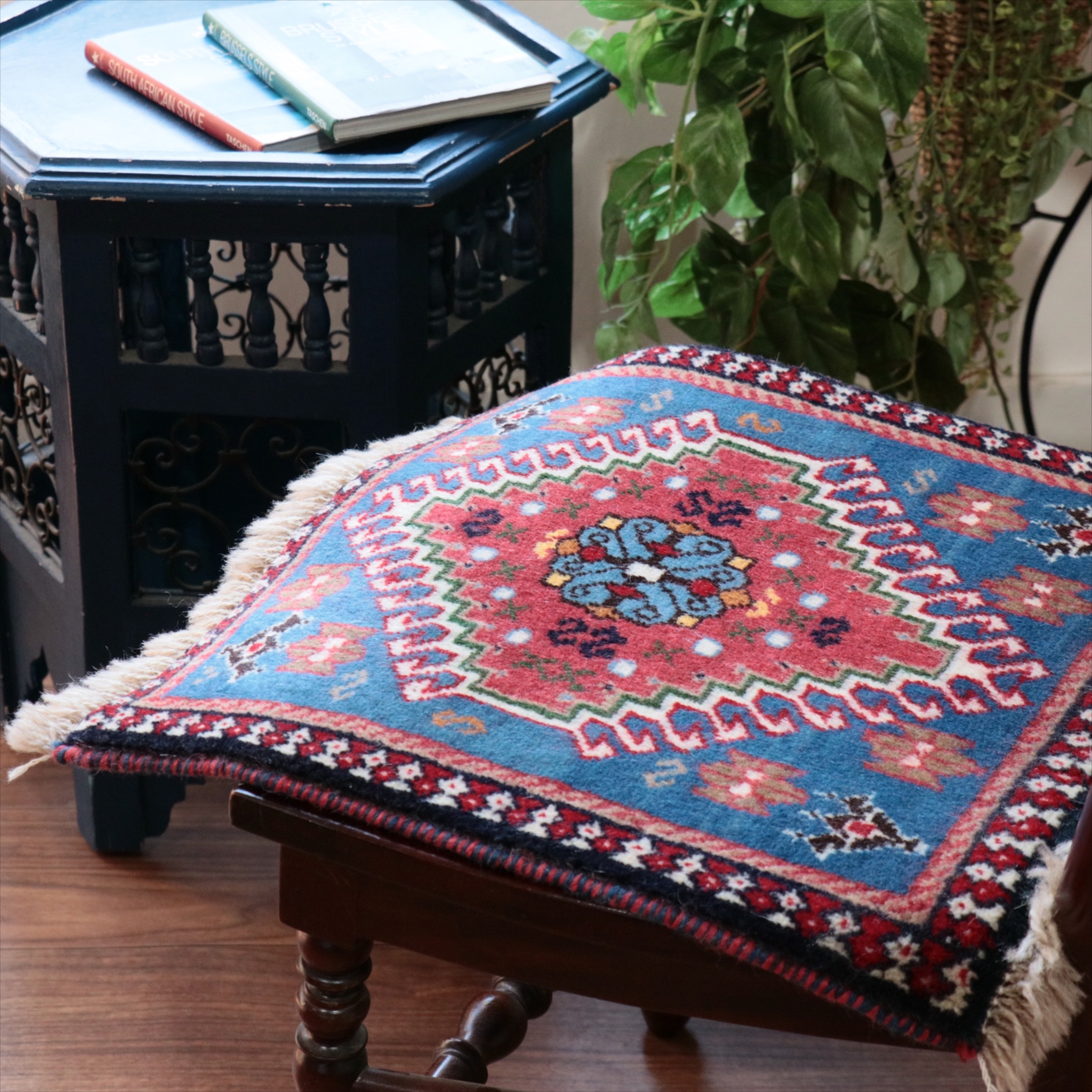 40cm角のミニサイズのラグ。小さいながらも、織りはしっかりしていて本格的です。多少ゆがみが気になりますが、ゆがみも含めて素朴な感じをお楽しみいただければと思います。