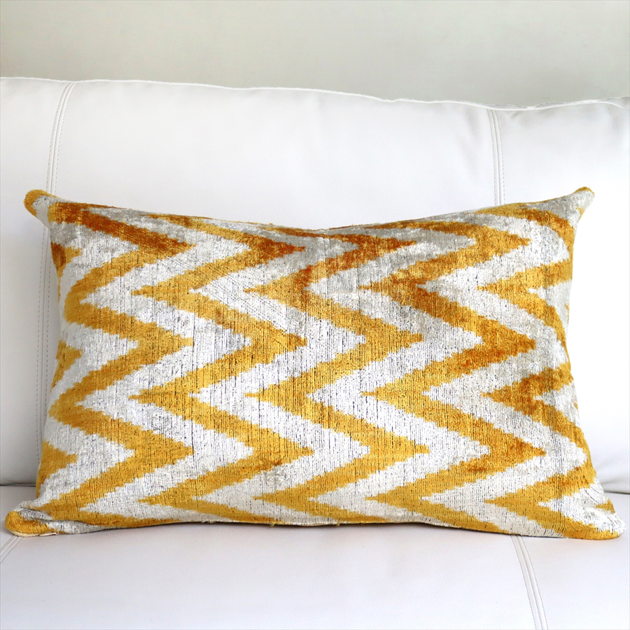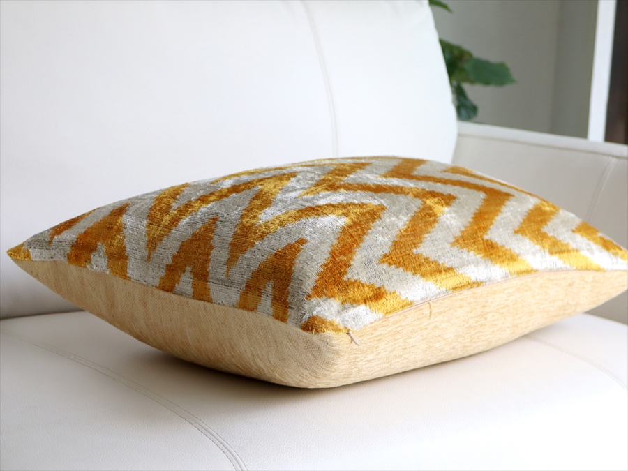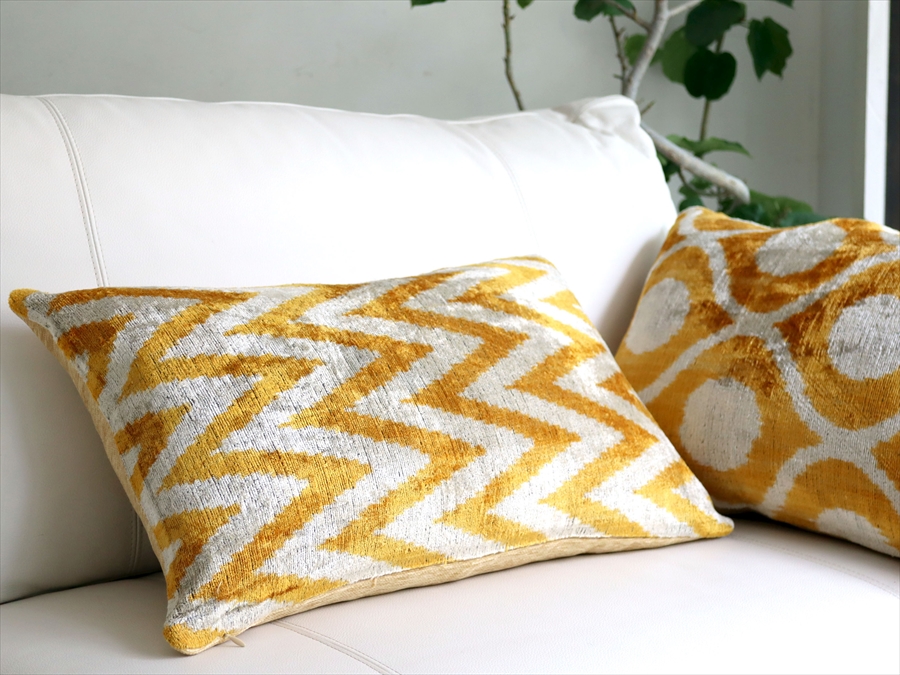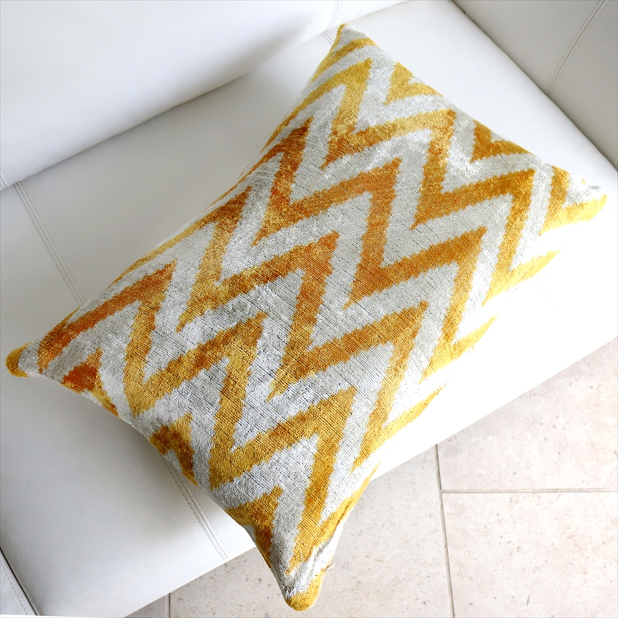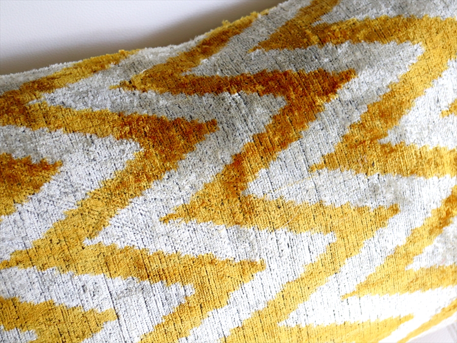 ウズベキスタン・アトラス(イカット・絣) クッション 横長クッションカバー・ピローケース シルクベルベット 58×38cm イエローのジグザグ