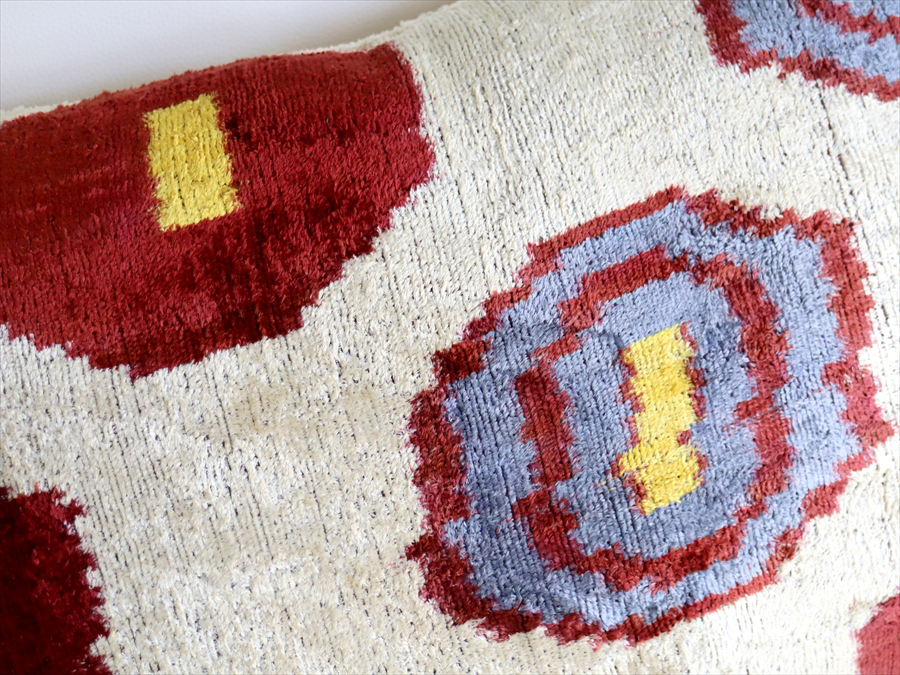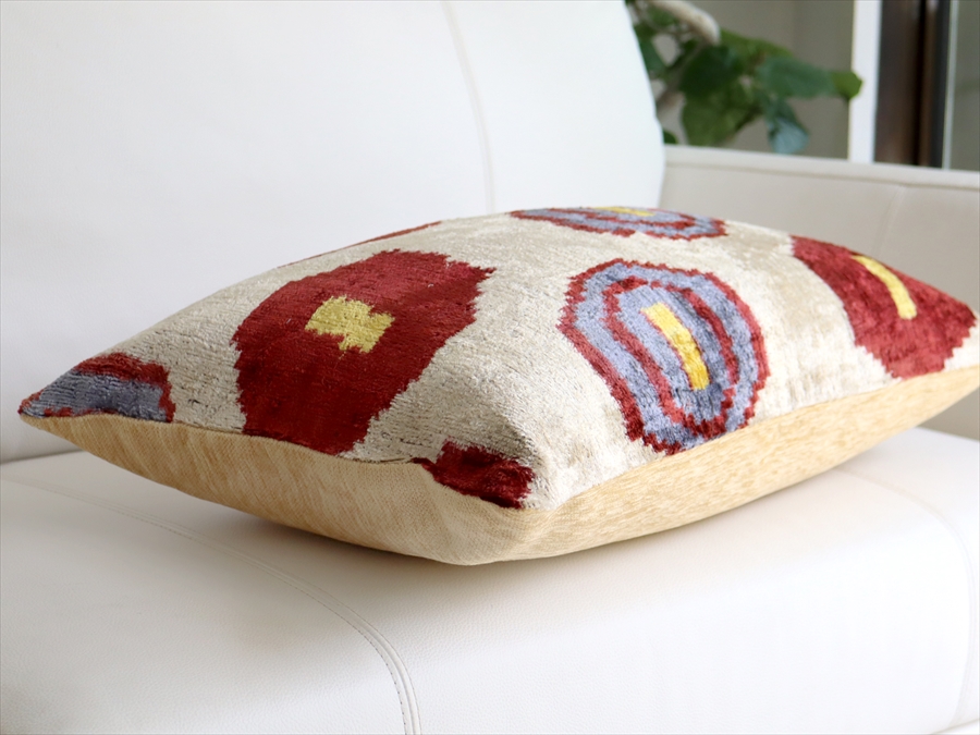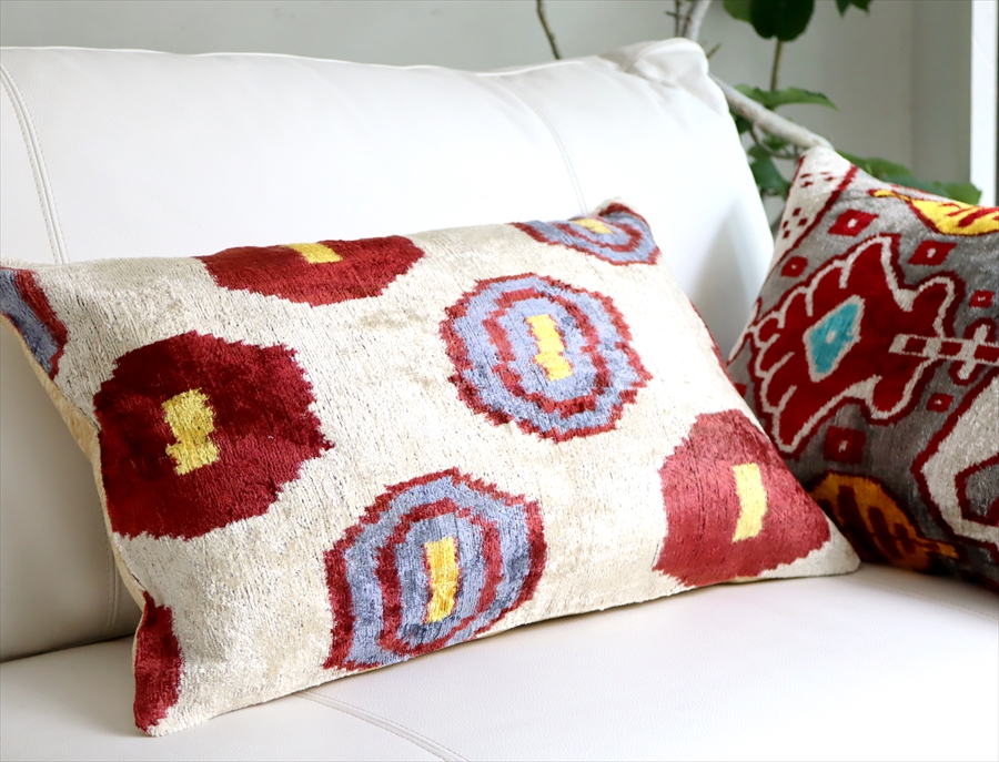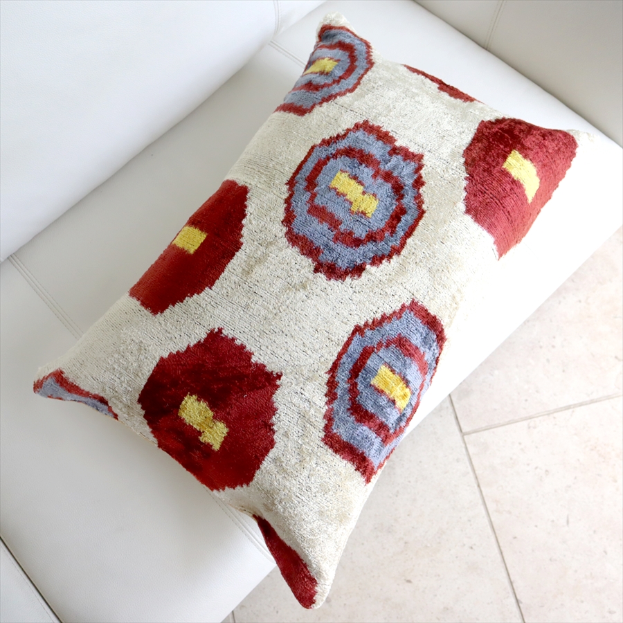 ウズベキスタン・アトラス(イカット・絣) クッション 横長クッションカバー・ピローケース シルクベルベット 59×38cm 赤い水玉/裏面の色はアイボリー