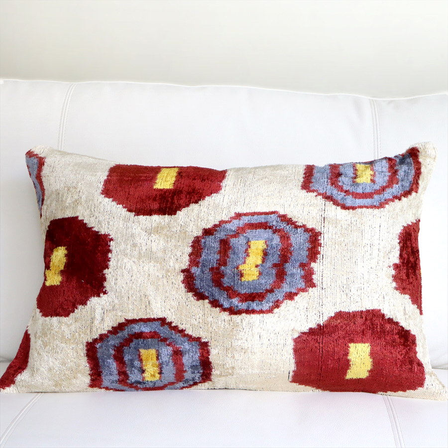 - ウズベキスタン・アトラス(イカット・絣) クッション 横長クッションカバー・ピローケース シルクベルベット 59×38cm 赤い水玉/裏面の色はアイボリー