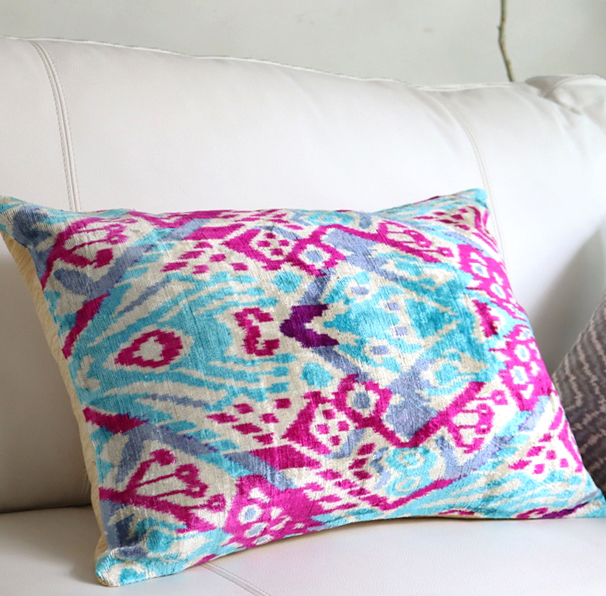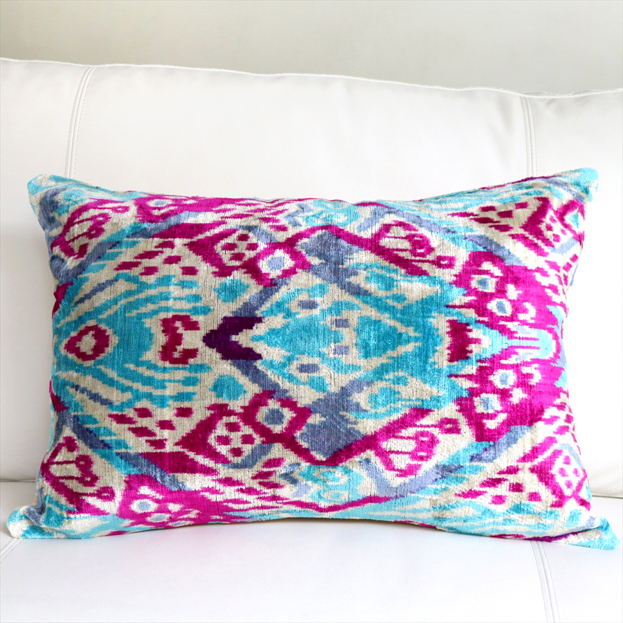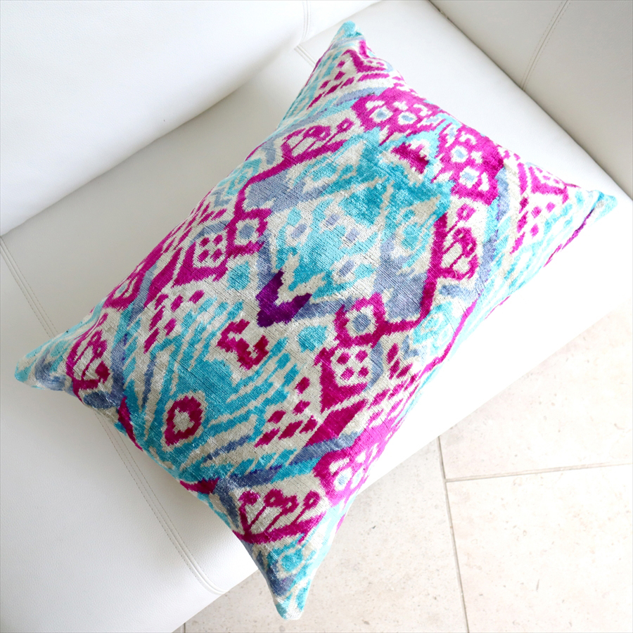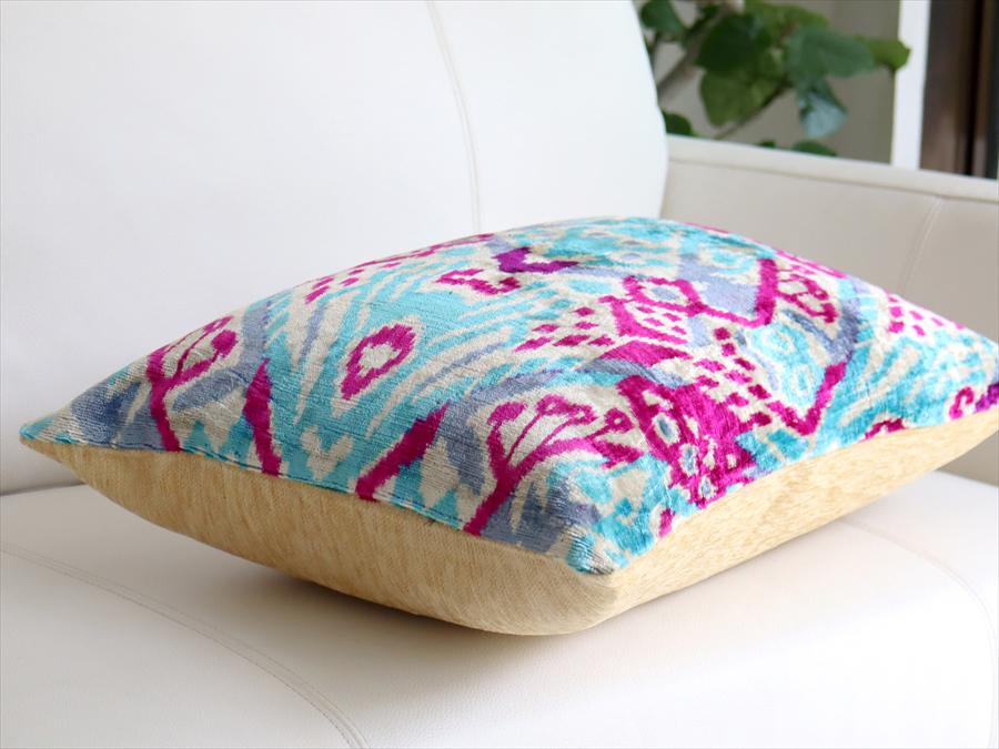 ウズベキスタン・アトラス(イカット・絣) クッション 横長クッションカバー・ピローケース シルクベルベット 50×38cm ライトブルー&ピンク ボタニカル
