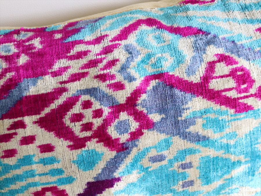 表面は起毛(ベルベット・イカット)していて柔らかな手触り。裏面はシンプルな無地のシュニール生地です。