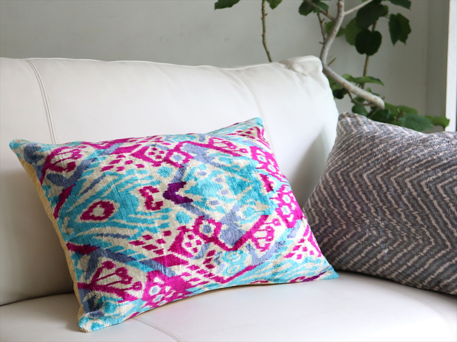 ウズベキスタンで「アトラス」と呼ばれる、中央アジアの女性たちの衣装用に織られた、手機織りの絣布(かすり・イカット)を使ったクッションカバー。