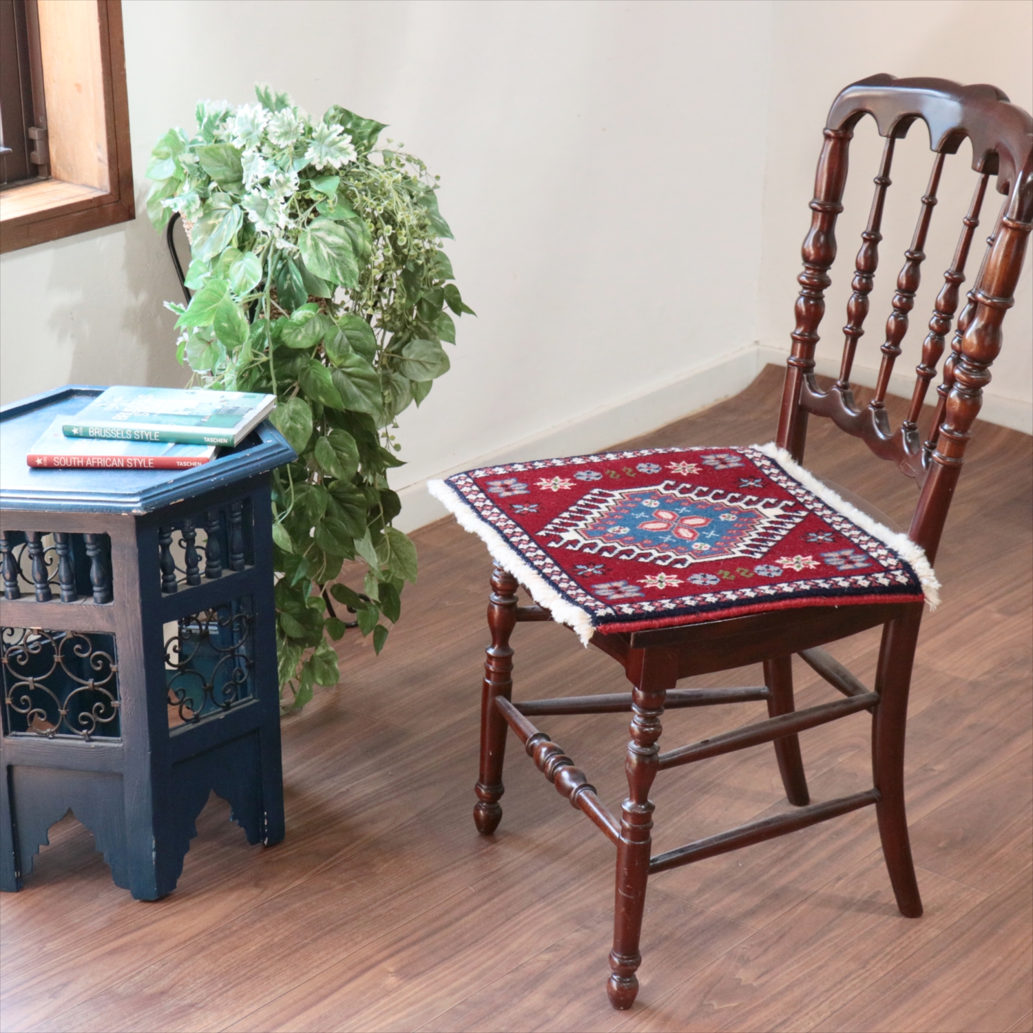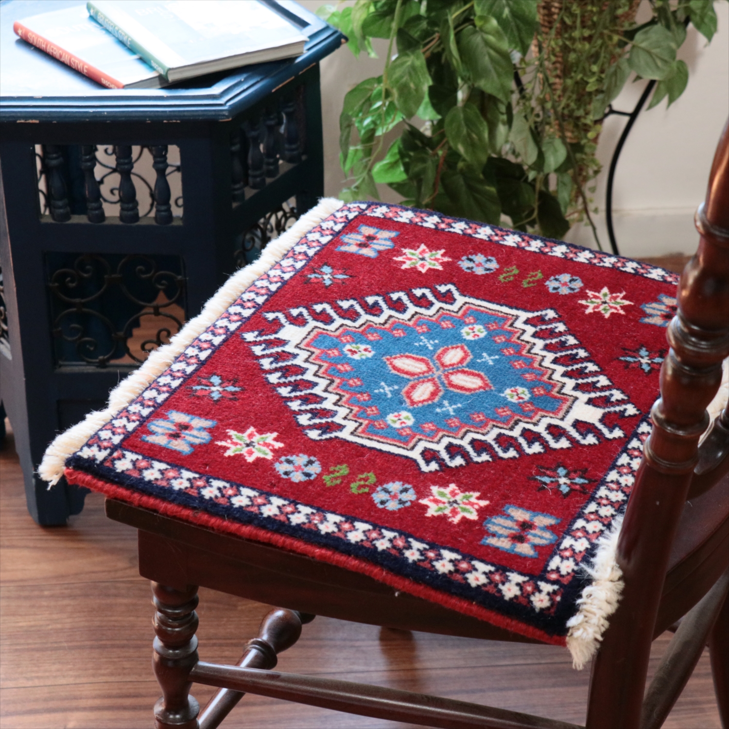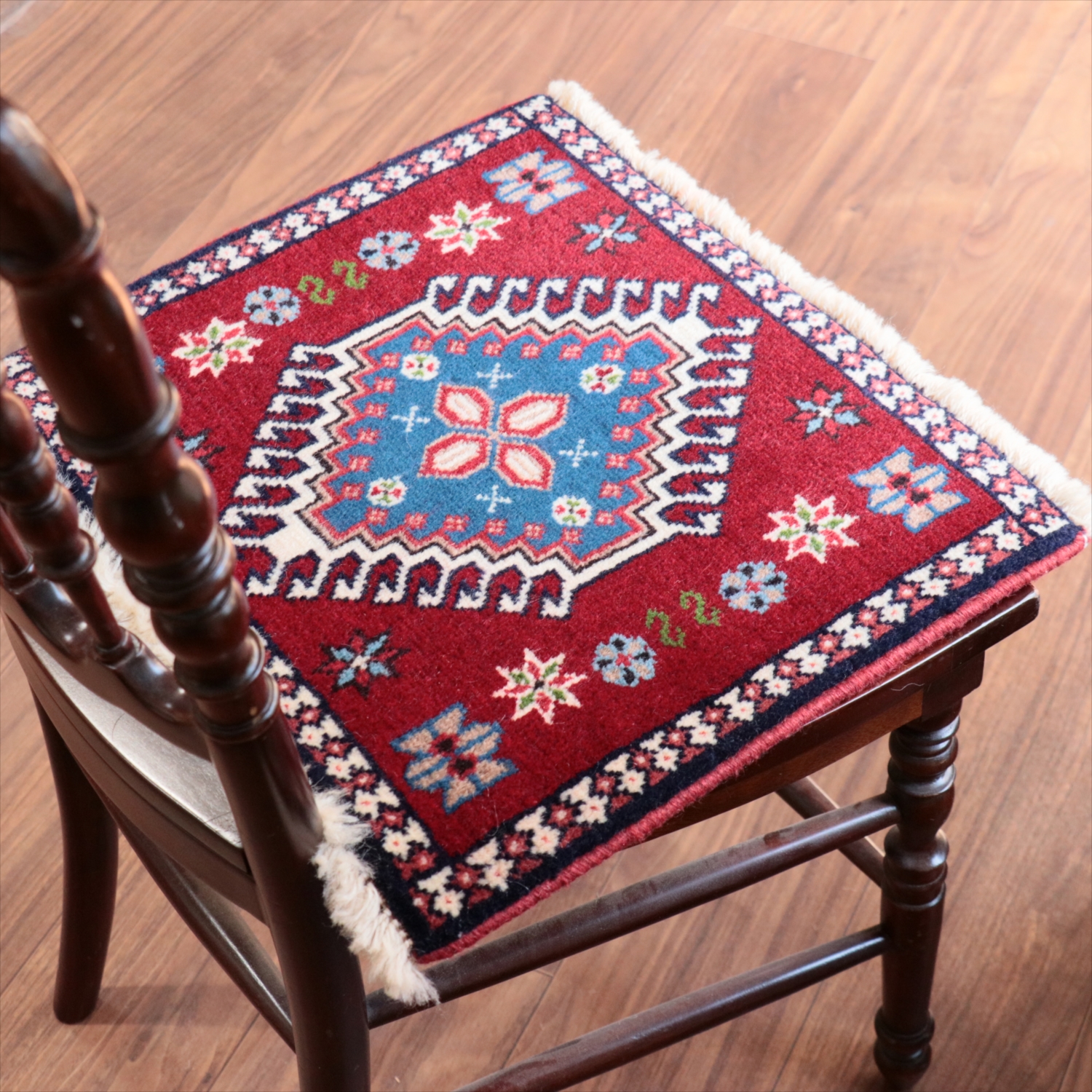 40cm角のミニサイズのラグ。小さいながらも、織りはしっかりしていて本格的です。多少ゆがみが気になりますが、ゆがみも含めて素朴な感じをお楽しみいただければと思います。