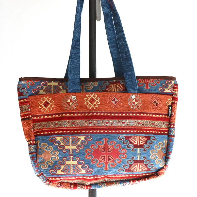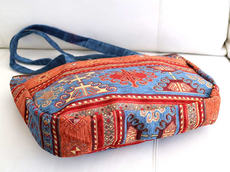 トルコの伝統柄を織り込んだエスニックなデザイン&カラーのショルダーバッグです。ベッドカバーやクッションカバーなどに使われる、起毛のあるシュニール織りのインテリアファブリックを使って作られています。