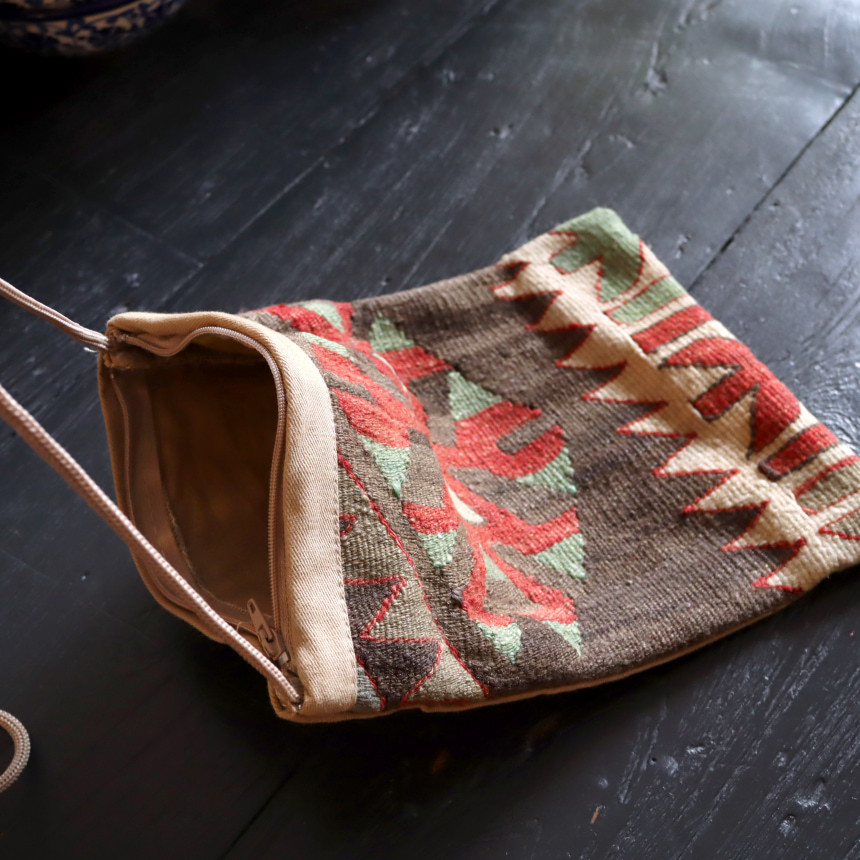 表面はオールドキリム、裏面にベージュのコットン地を張った定番のキリムポシェットです。上部口の部分はジッパーがついています。