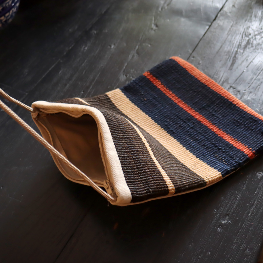 表面はオールドキリム、裏面にベージュのコットン地を張った定番のキリムポシェットです。上部口の部分はジッパーがついています。