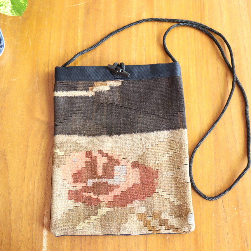 表面はオールドキリム、裏面に黒のコットン地を張った定番のキリムポシェットです。上部口の部分はボタンにロープをかけてとめる仕様。