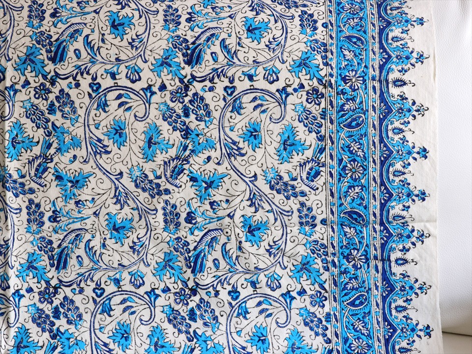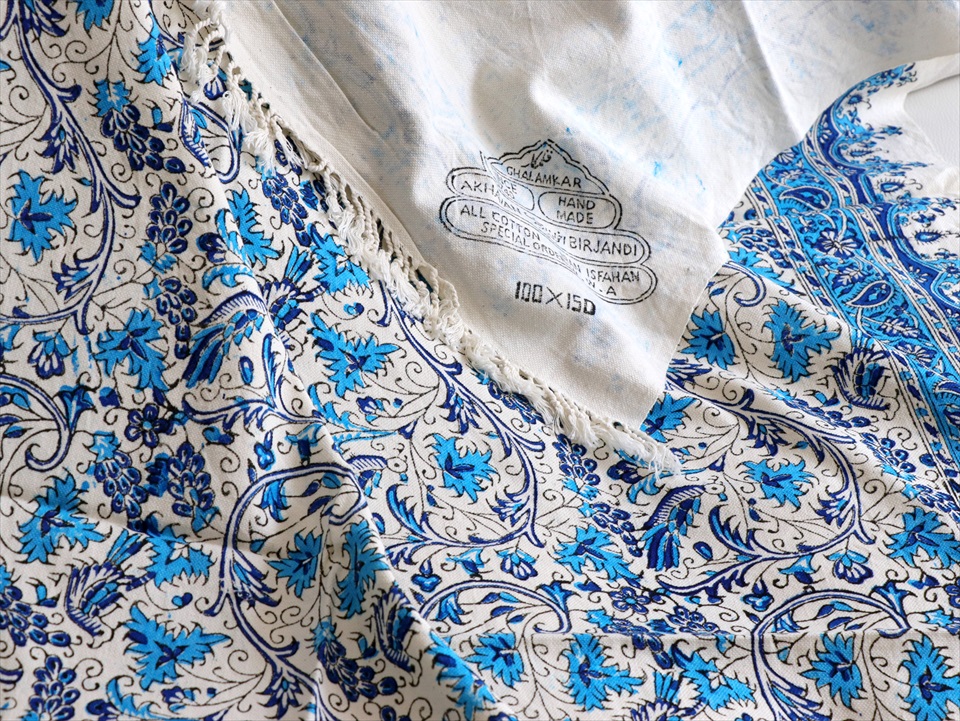 中世よりの伝統的な技法をそのまま使って、手彫りの木製のスタンプを重ねて手作業で染め上げたハンドプリントの更紗(さらさ)布です。イランの古都イスファハンの工房で、職人さんが一点ずつ丁寧に染めています。