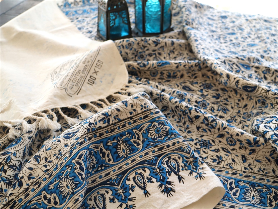 Key:コットン・染色・ブロックプリント・木版・捺染・伝統工芸・インド更紗・ジャワ更紗・ペルシャブルー・ペイズリー・フリークロス・マルチカバー・ベッドスプレッド・ベッドカバー・ソファカバー・カーテン・タペストリー・ファブリック・インテリアファブリック・クラフト・インテリア・ペルシャ・ペルセポリス・イラン・中東・シルクロード・アジアン・エスニック