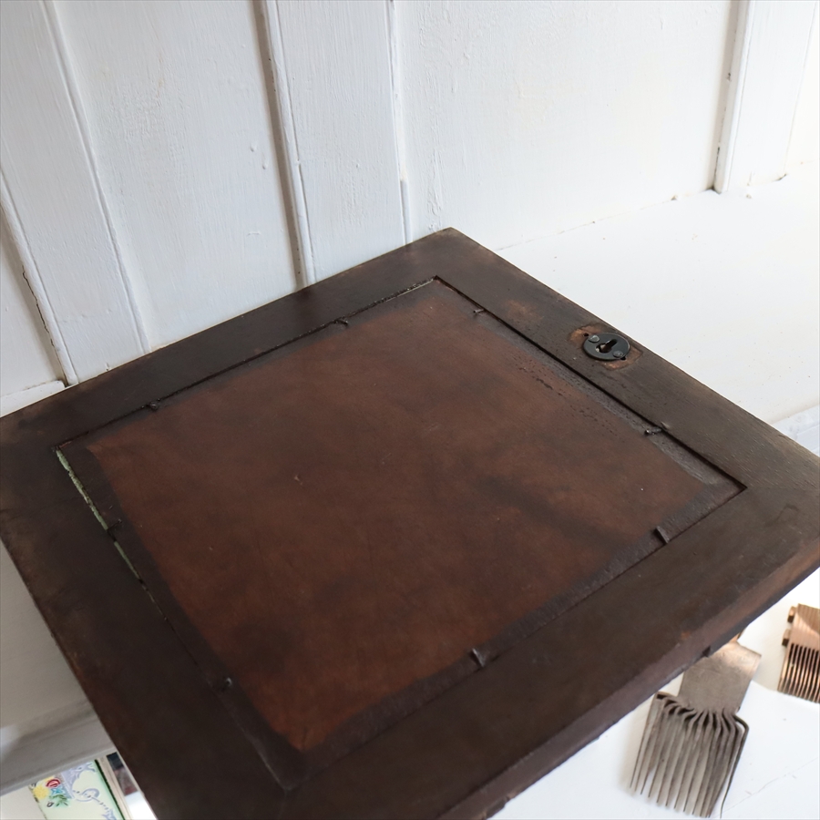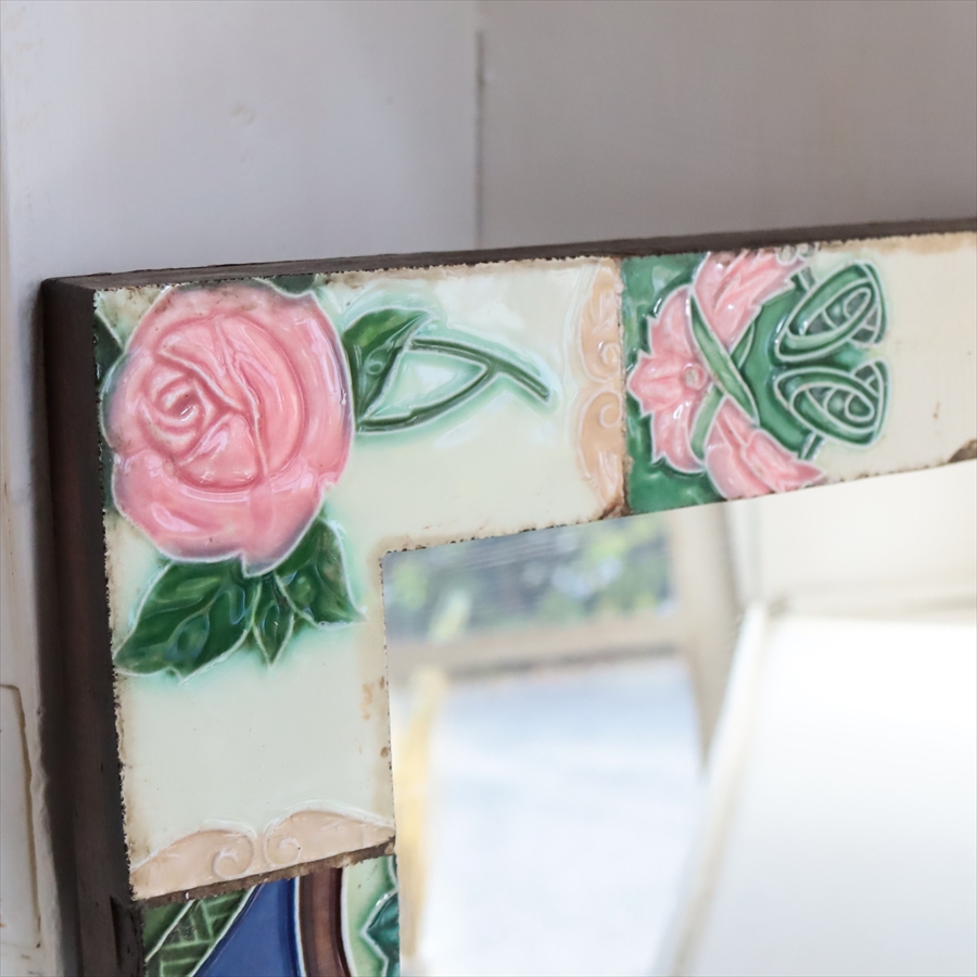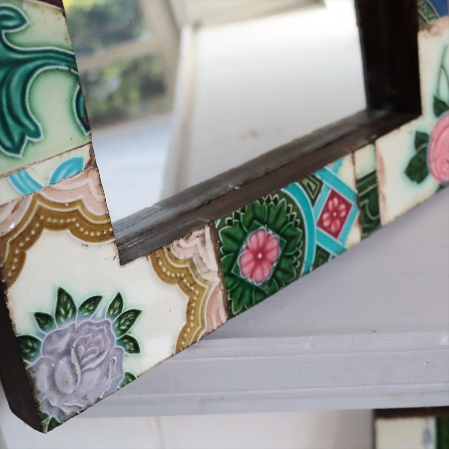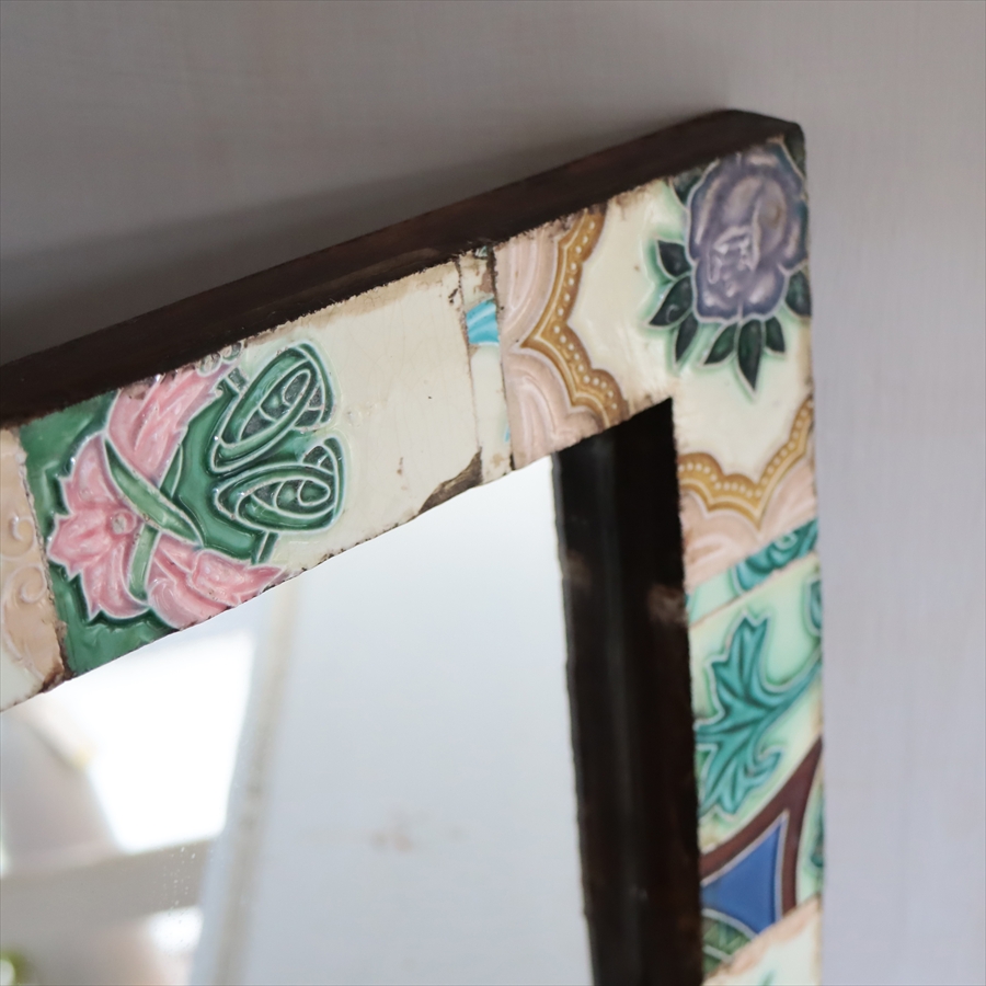 インドのアンティークショップで発見された、大正末期から昭和初期に日本で作られたマジョリカタイル。 貴重なタイルを使用して壁掛けミラーに生まれ変わりました。裏側には壁掛け用の穴が空いています。古き良きアンティークの雰囲気をお楽しみください。ミラー部分の大きさ20.5×20.5cm。