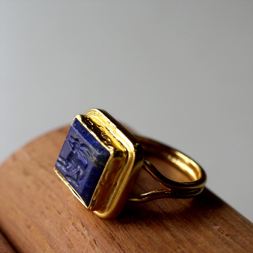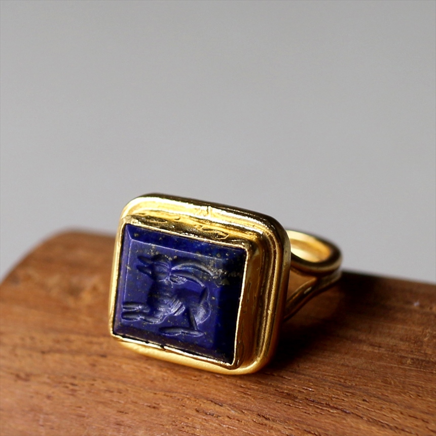 深いブルーの天然石(ラピスラズリ)に、山羊のような動物モチーフを沈み彫した、トルコ製のインタリオリングです。クラシカルな雰囲気の存在感のある一点です。