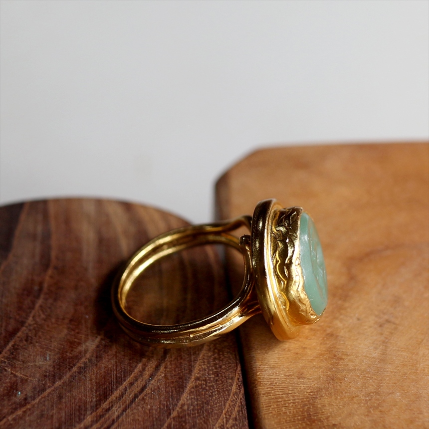 アルサメイア インタリオリング ラウンド グリーンジェイド 天然石22Kゴールドプレーテッド トルコジュエリー