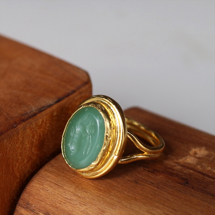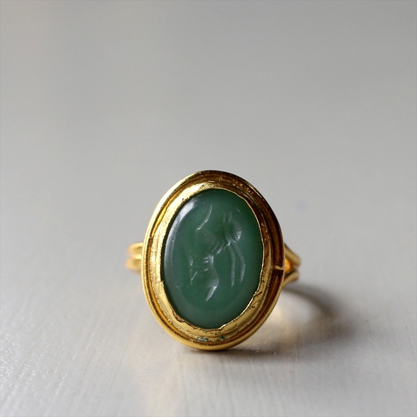 天然石に動物モチーフを、一つ一つ丁寧に沈み彫り(インタリオ)した、クラシカルな雰囲気のリングです。