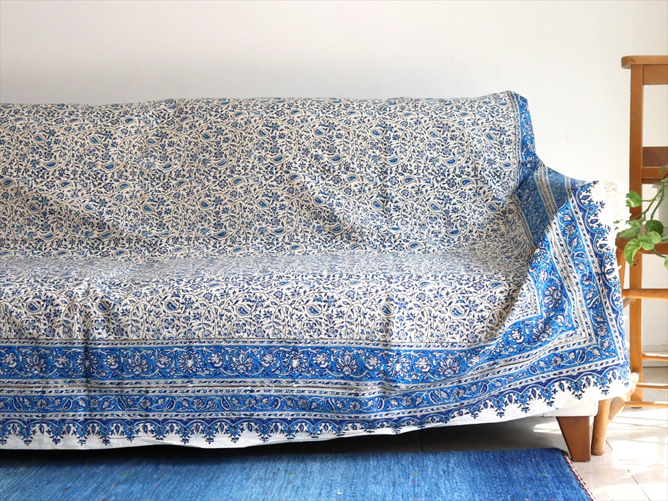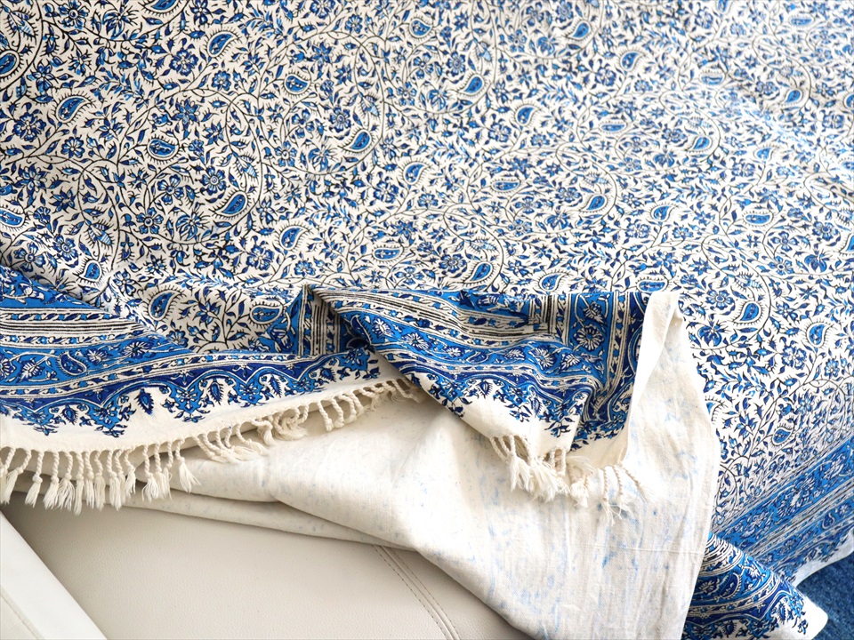 ペルシャ更紗・イラン手染め布/236x153cm ソファーカバー・テーブルクロス ブルー系フラワー柄
