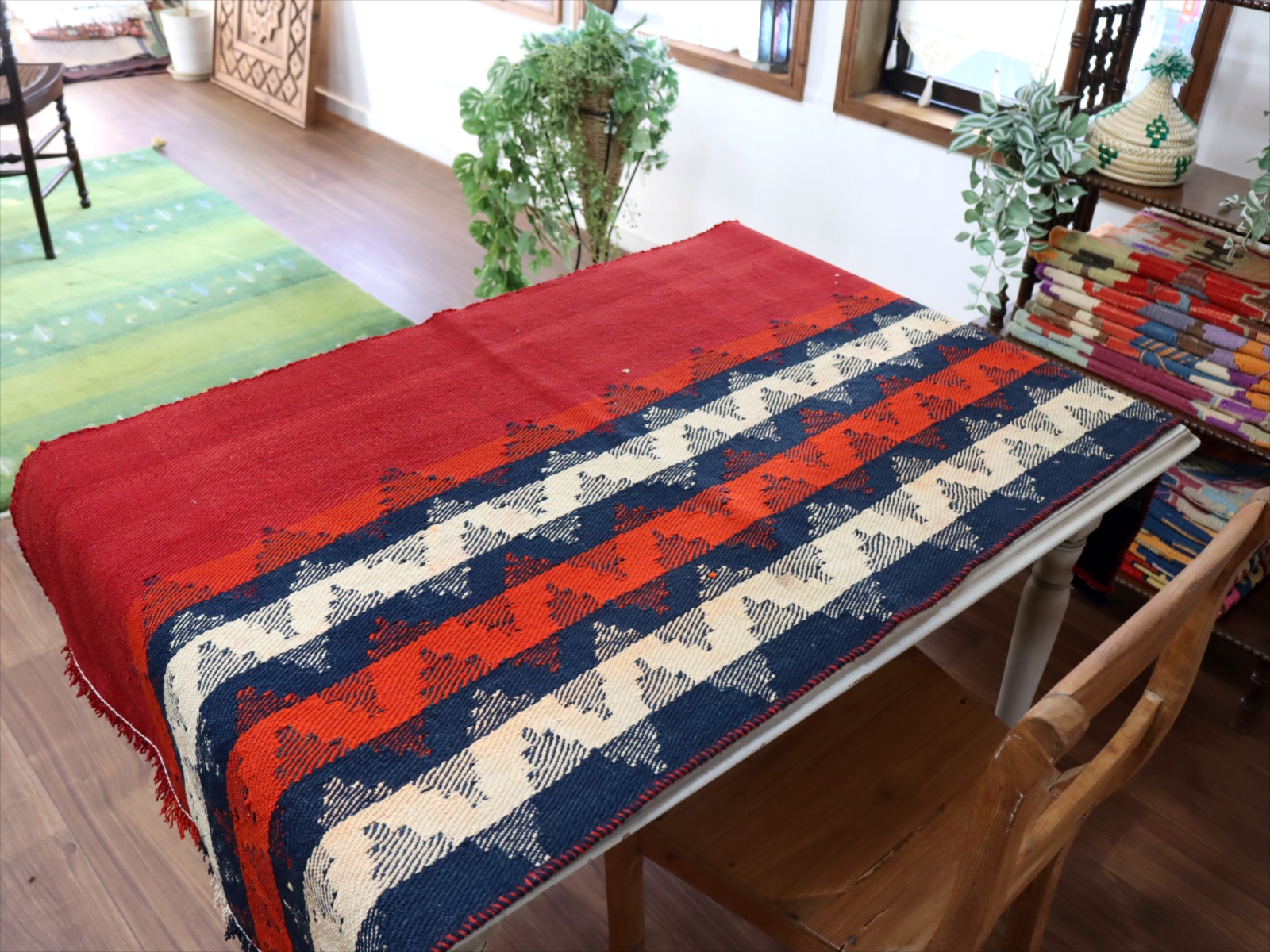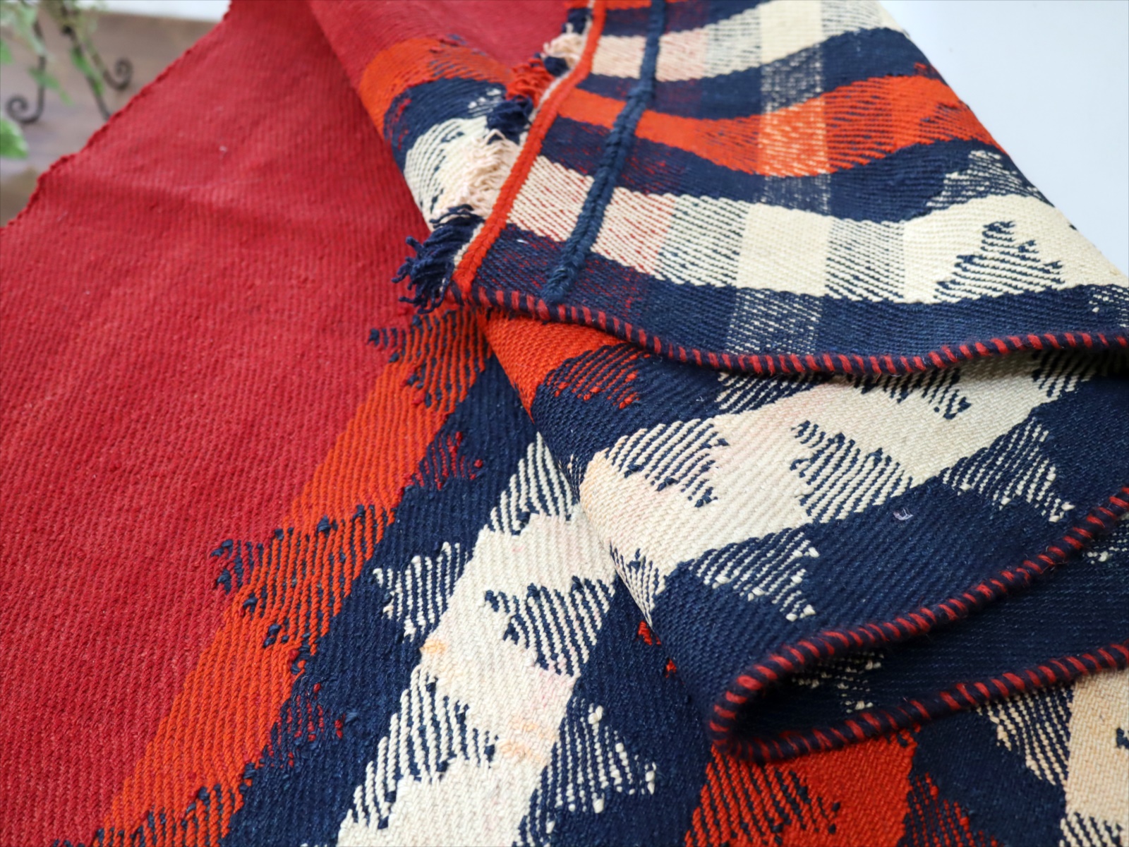 カシュカイ族の織るキリムは一般的にトルコキリムより厚みがありがっちりとした質感です。織り地は厚みがあり、ぎゅっと目が詰まって、固くしっかりとしています。