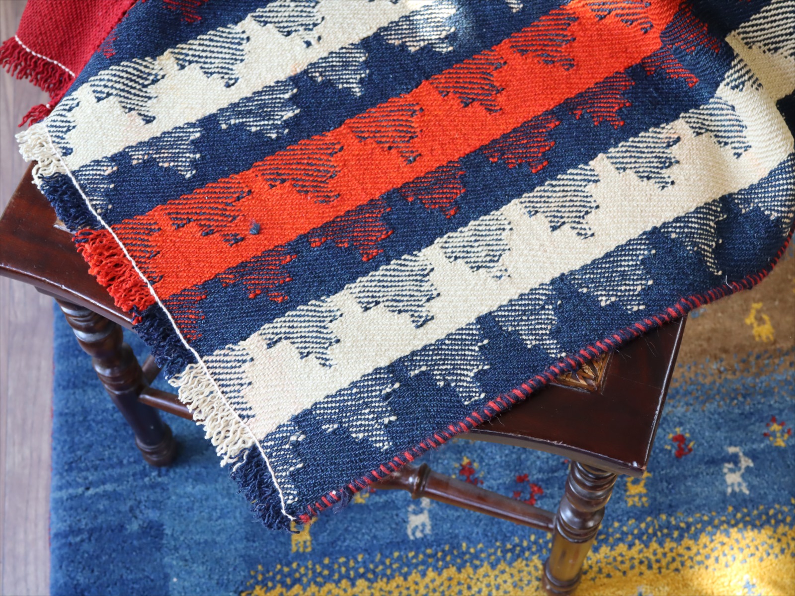 カシュカイ族の織るキリムは一般的にトルコキリムより厚みがありがっちりとした質感です。織り地は厚みがあり、ぎゅっと目が詰まって、固くしっかりとしています。