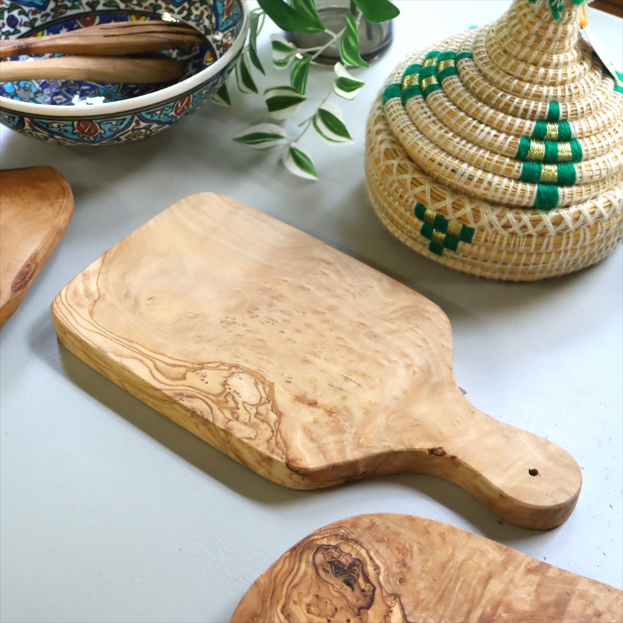 チュニジアの職人が丹精込めて作った、自然なテイストが人気のオリーブの木のキッチン用品。自然木を生かした美しい形で、そのままテーブルにも出せるお洒落なまな板です。