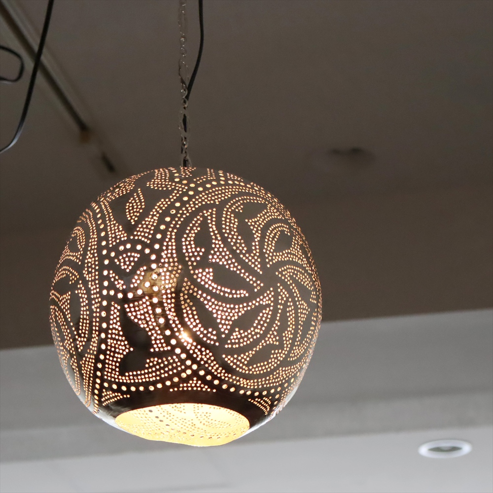 メタルを薄く加工し、コンコンと小さな穴をあけて光をデザインするランプシェードを作りました。中世から作られて来た伝統的な技法で、細工からこぼれる光が壁に映り、エキゾチックな雰囲気を楽しめます。