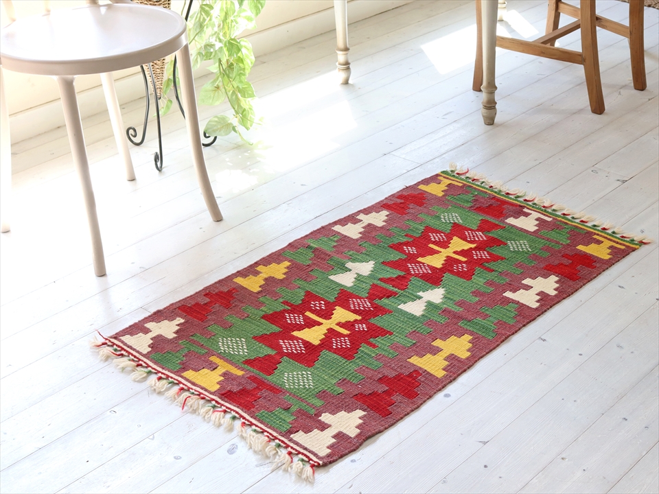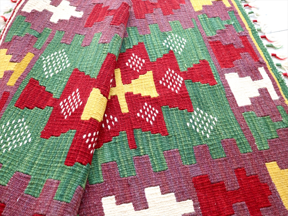 やわらかくしなやかな織り地。厚みは、キリムとしては標準的でおよそ5mm弱の薄手の平織りの敷物です。色の切替部分は、キリムの織りの特徴で、縦に隙間が開いています(スリットと呼んでいます)。