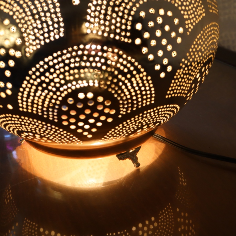 メタルを薄く加工し、コンコンと小さな穴をあけて光をデザインするランプシェードを作りました。中世から作られて来た伝統的な技法で、細工からこぼれる光が壁に映り、エキゾチックな雰囲気を楽しめます。