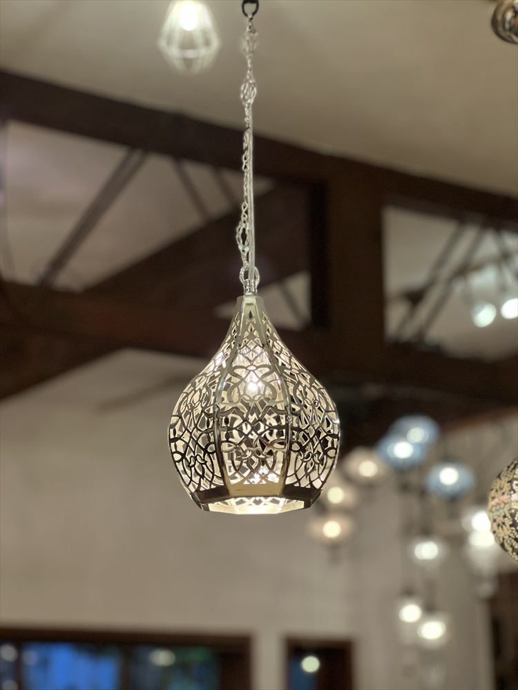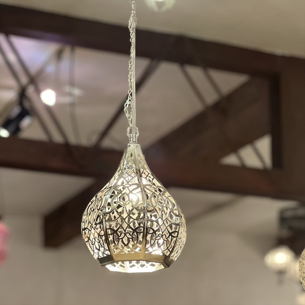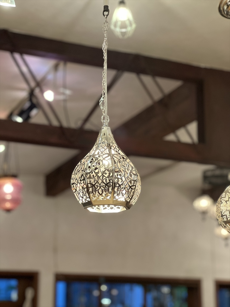 レーザーカットで切り抜かれたアラベスク模様の美しいランタン形のランプです。壁や天井に写る陰影が幻想的な雰囲気を演出します。クリアタイプの電球のほか、色付きの電球を使うとエキゾチックなイメージになります。いろいろアレンジして、お楽しみください。