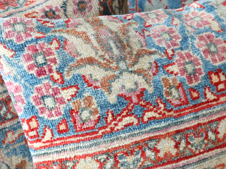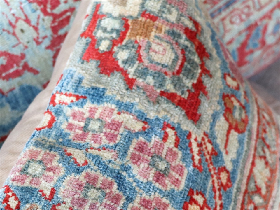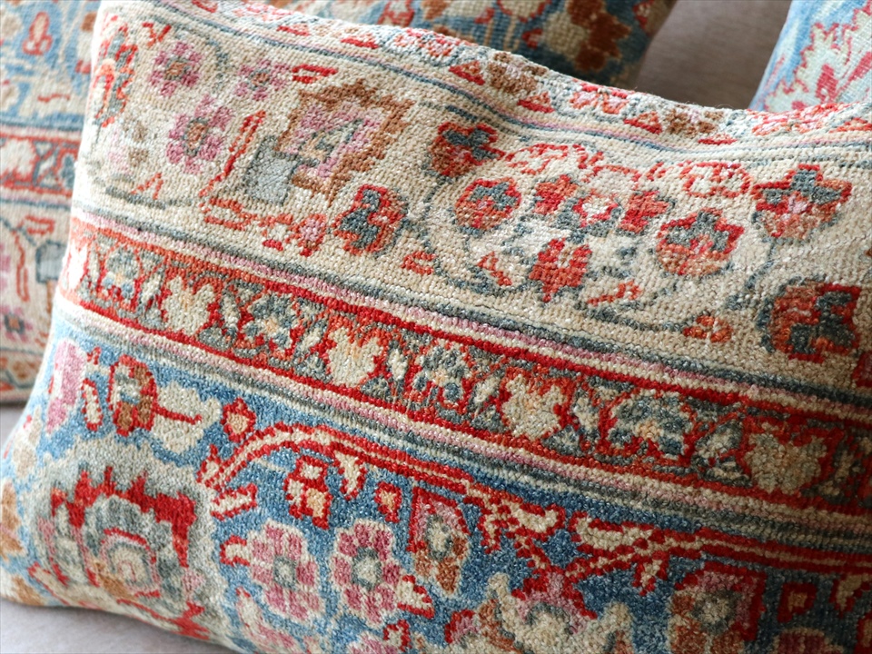 ブルーをベースにした華やかなフラワーモチーフが並ぶコンヤ地方の手織りじゅうたんを、ブリーチ加工してクッションに仕立てました。じゅうたんの織りがとても細かく、かっちりと引き締まった固めの質感。パイル(毛足)は短く、ところどころすり減っていてパイルの根元の結び目が見えているところなどあります。