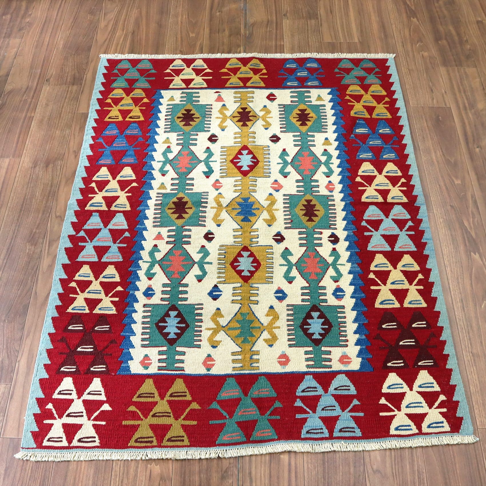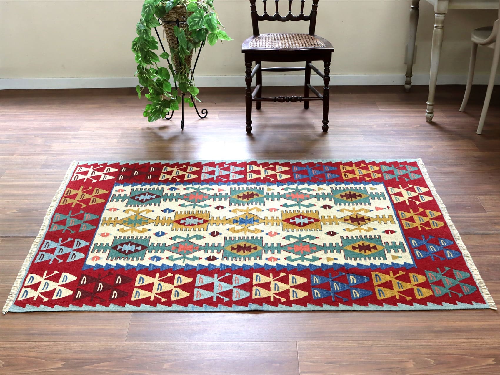 発色がよく鮮やかな色使いのウシャクキリム。ボーダーのレッドが力強く、引き締まったデザインに。