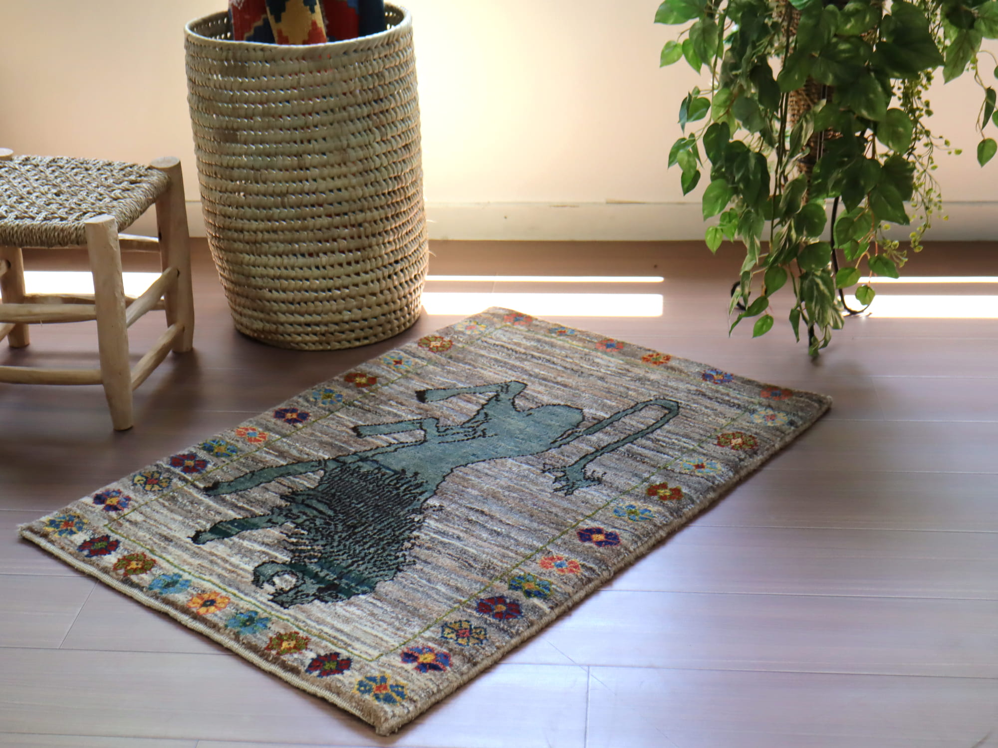 Key:Gabbeh, Lion rug, Tribal rug, ライオンギャッベ, ラグ, ギャッベ, ギャベ, 部族絨毯, トライバルラグ, コレクタブル, ウール製, イラン, ペルシャ, 手織り, じゅうたん, 絨毯, グレー, ブルーグリーン