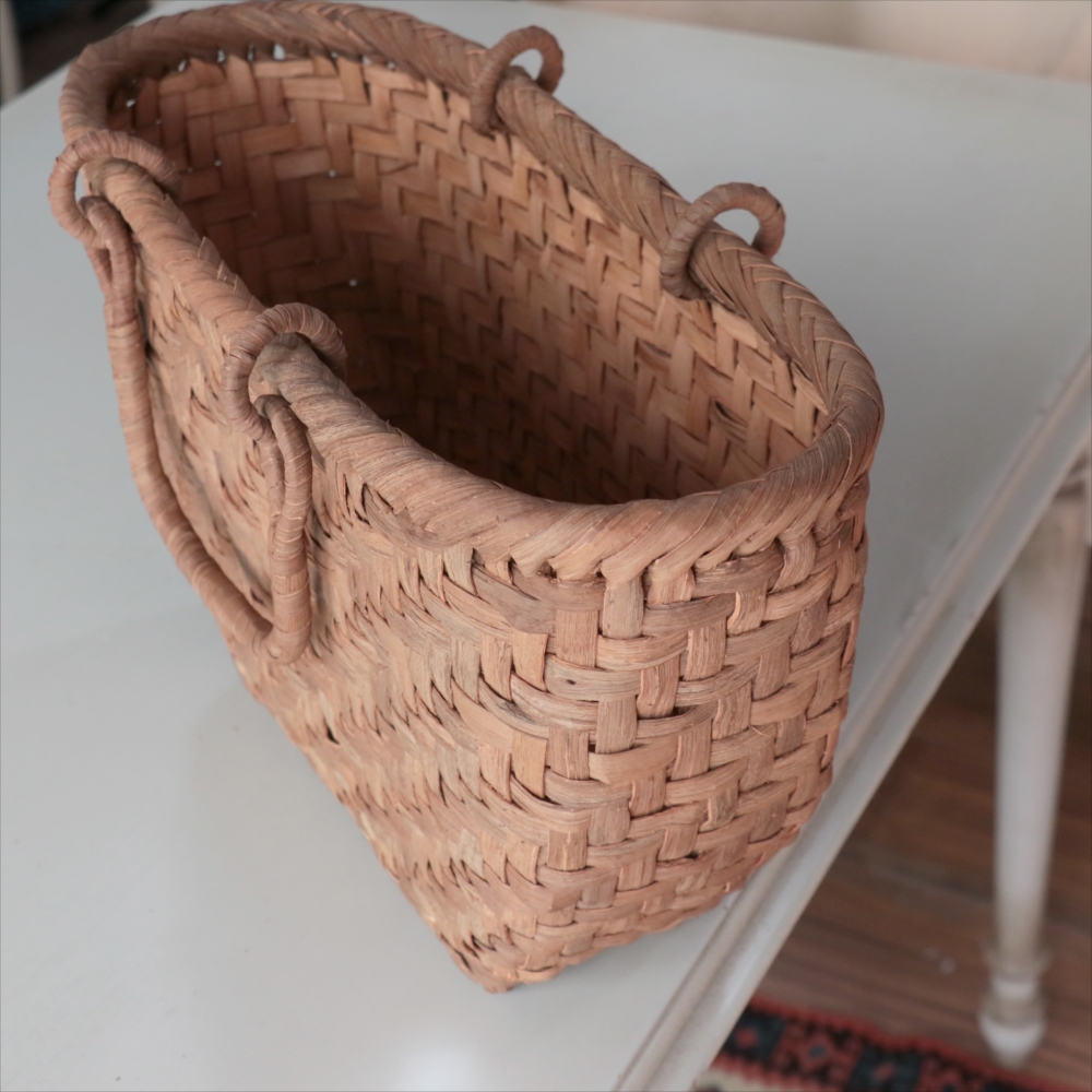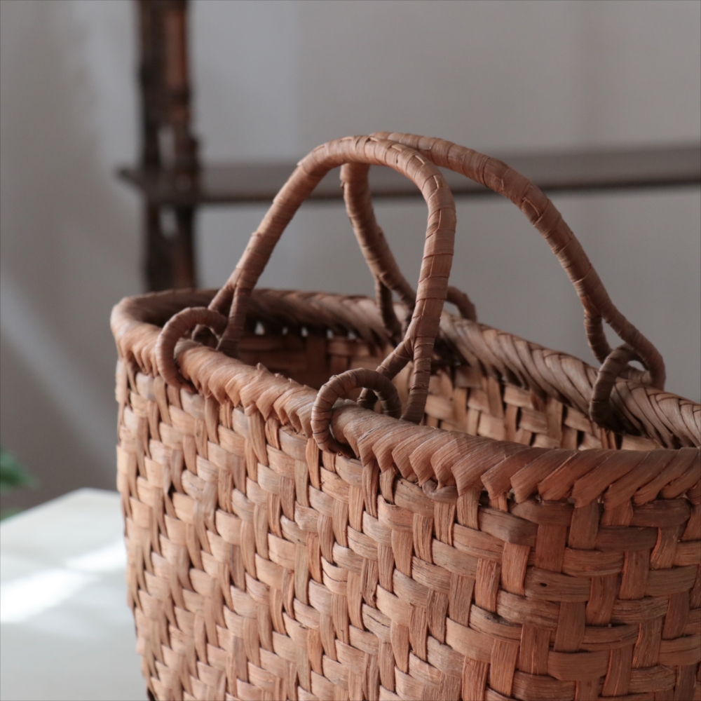 マルシェバッグと名づけられた大きめのやまぶどうのかごです。左右の曲線がきれいな仕上がりで、安定感もあります。持ち手は稼働式のリング手で、実用的。内布はないタイプなので、自分の好きな生地で巾着や風呂敷包みを入れたりして、アレンジしてお使いいただくのがおすすめです。