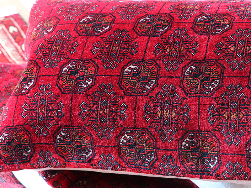 アフガニスタン北部で織られている、とても細かな織りの手織りじゅうたんからのカット。パイルはビロードのよう光沢があってなめらかな肌触りです。とても目のつまった織り地で、濃い深みのある色合いが魅力的です。