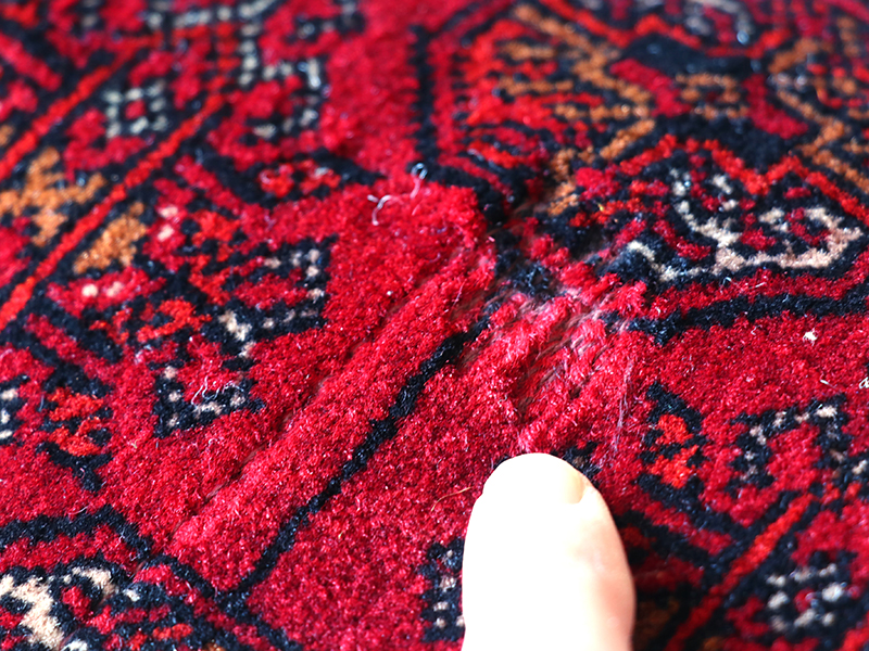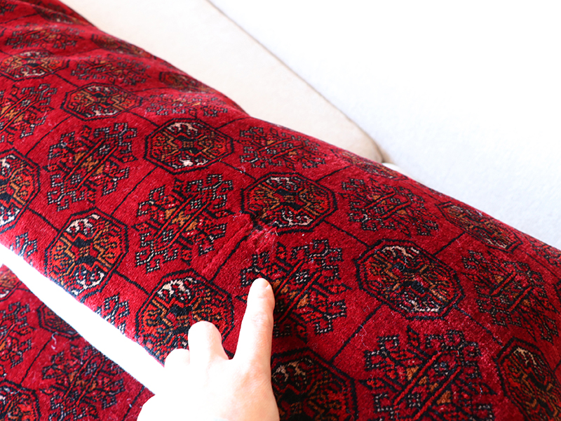 目のつまった織り地です。表面はとてもなめらかで、やさしい肌ざわり。一部パイルがなくなっている部分があり、家庭の修理が入っています。