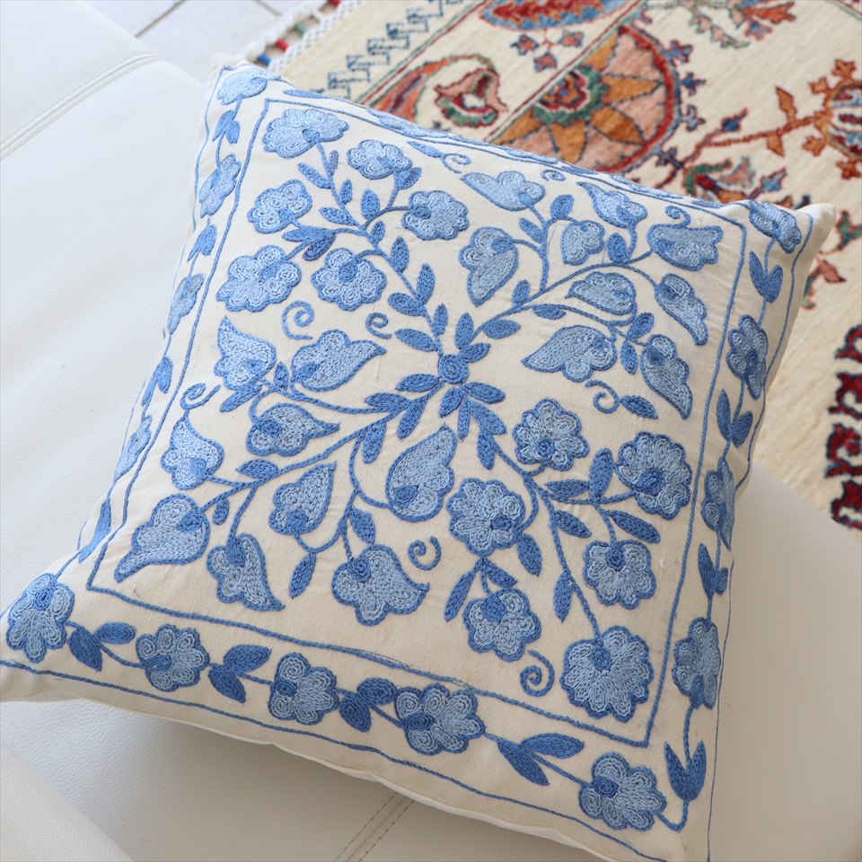 スザンニ クッションカバー/ウズベキスタン シルクの手刺繍 45×40cm ブルーの花模様