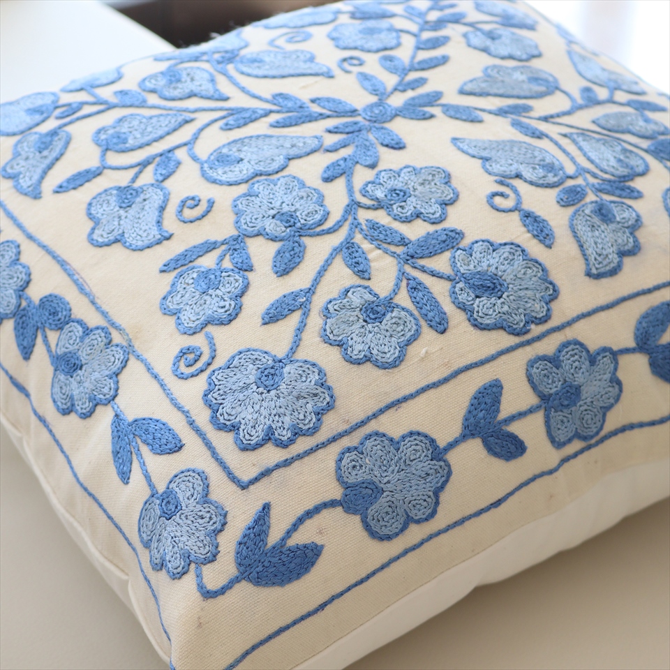- スザンニ クッションカバー/ウズベキスタン シルクの手刺繍 45×40cm ブルーの花模様