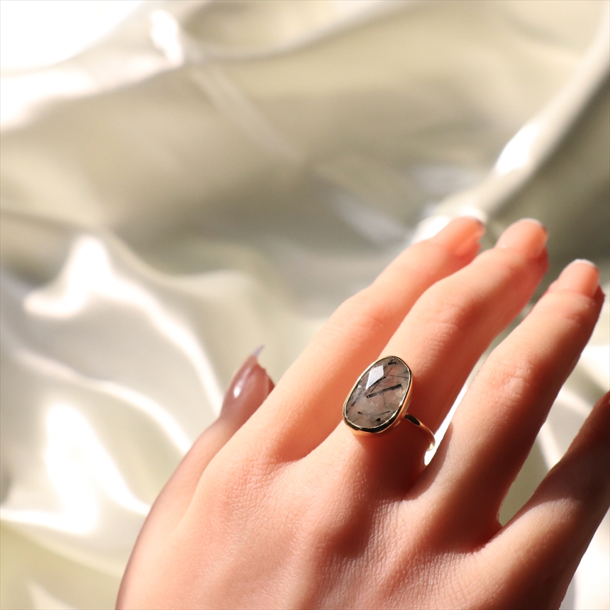 ラフにカットされたままのブラックルチルクォーツリング。水晶の中には美しい黒針状の結晶が輝きます。